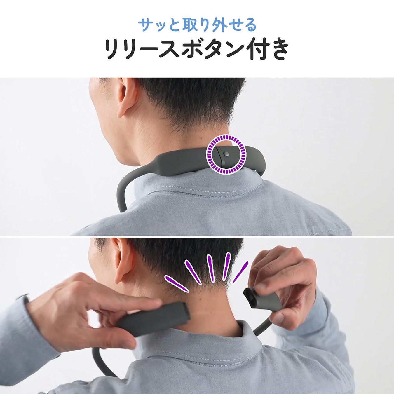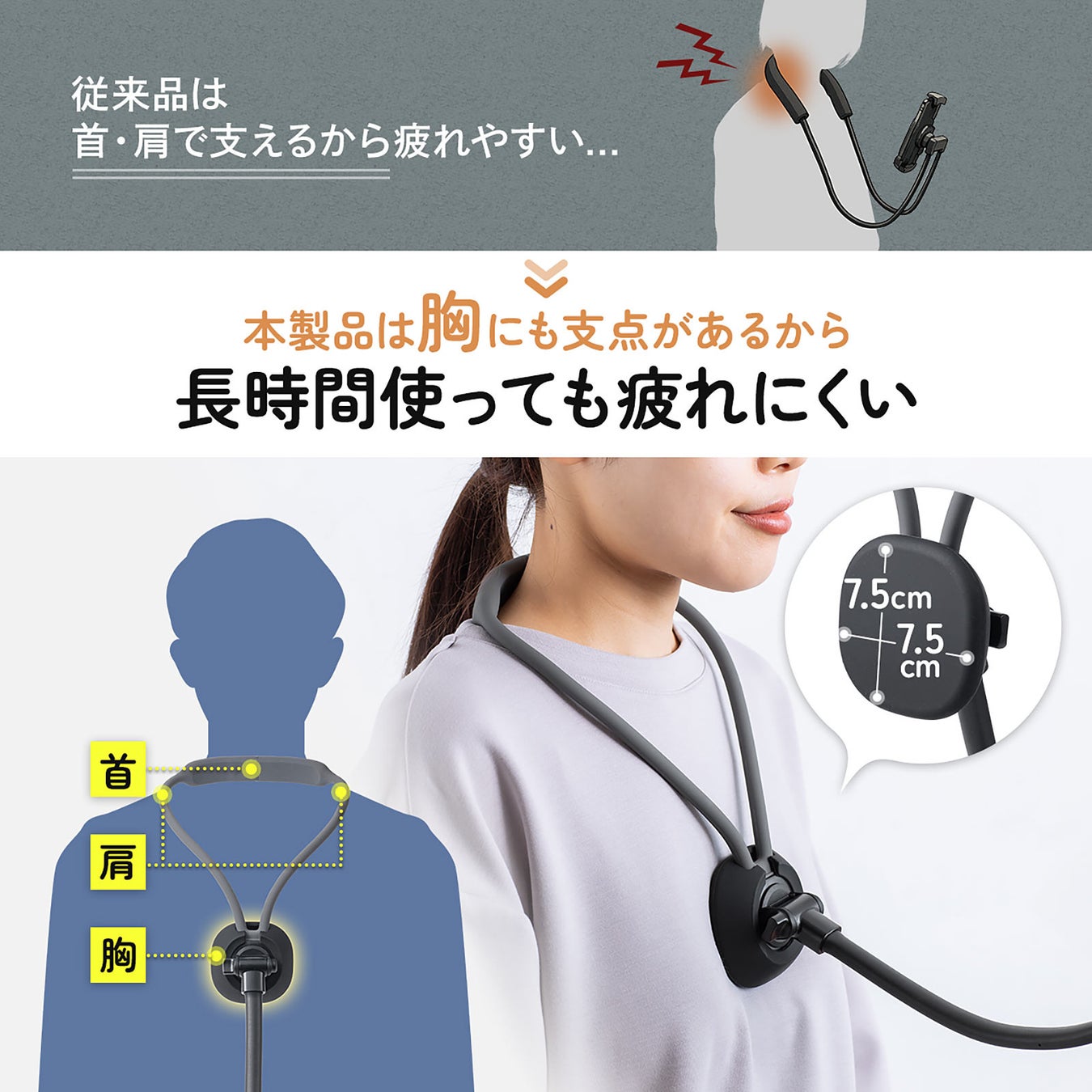 肌に触れる首かけ部分はやわらかなシリコン素材を採用。長時間使用してもストレスを感じにくい心地よい装着感を実現しました。本製品は胸にも支点があるため、長時間の使用においても首や肩への負担を軽減することができます。