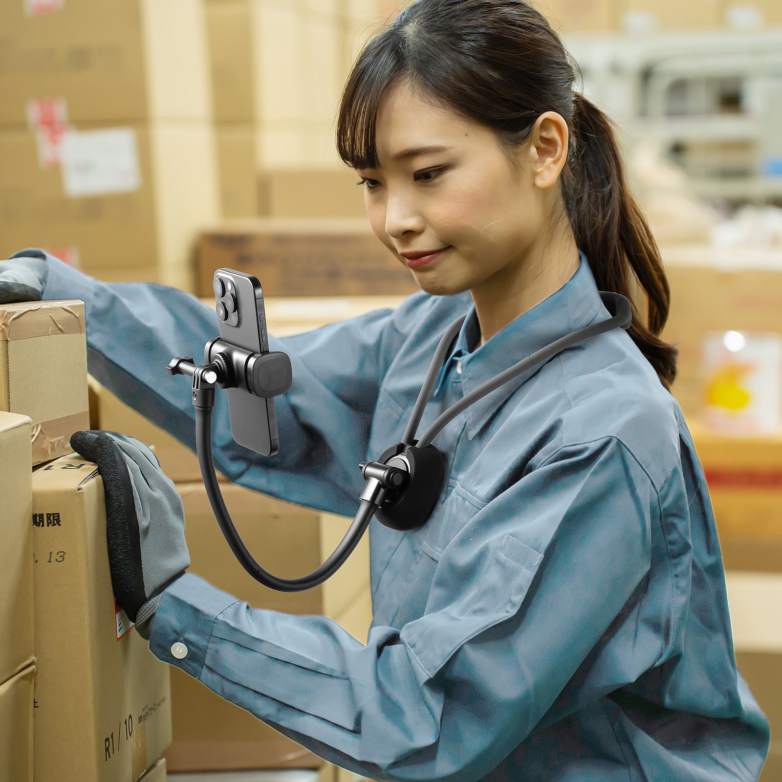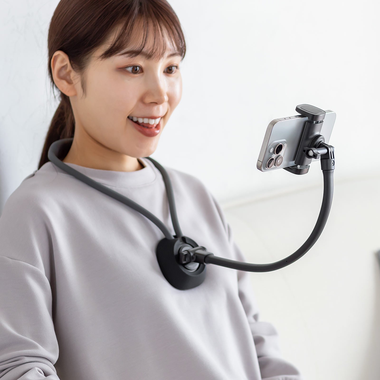 首にかけるだけでどこでもスマホを使用できる首掛けフレキシブルアームスタンド