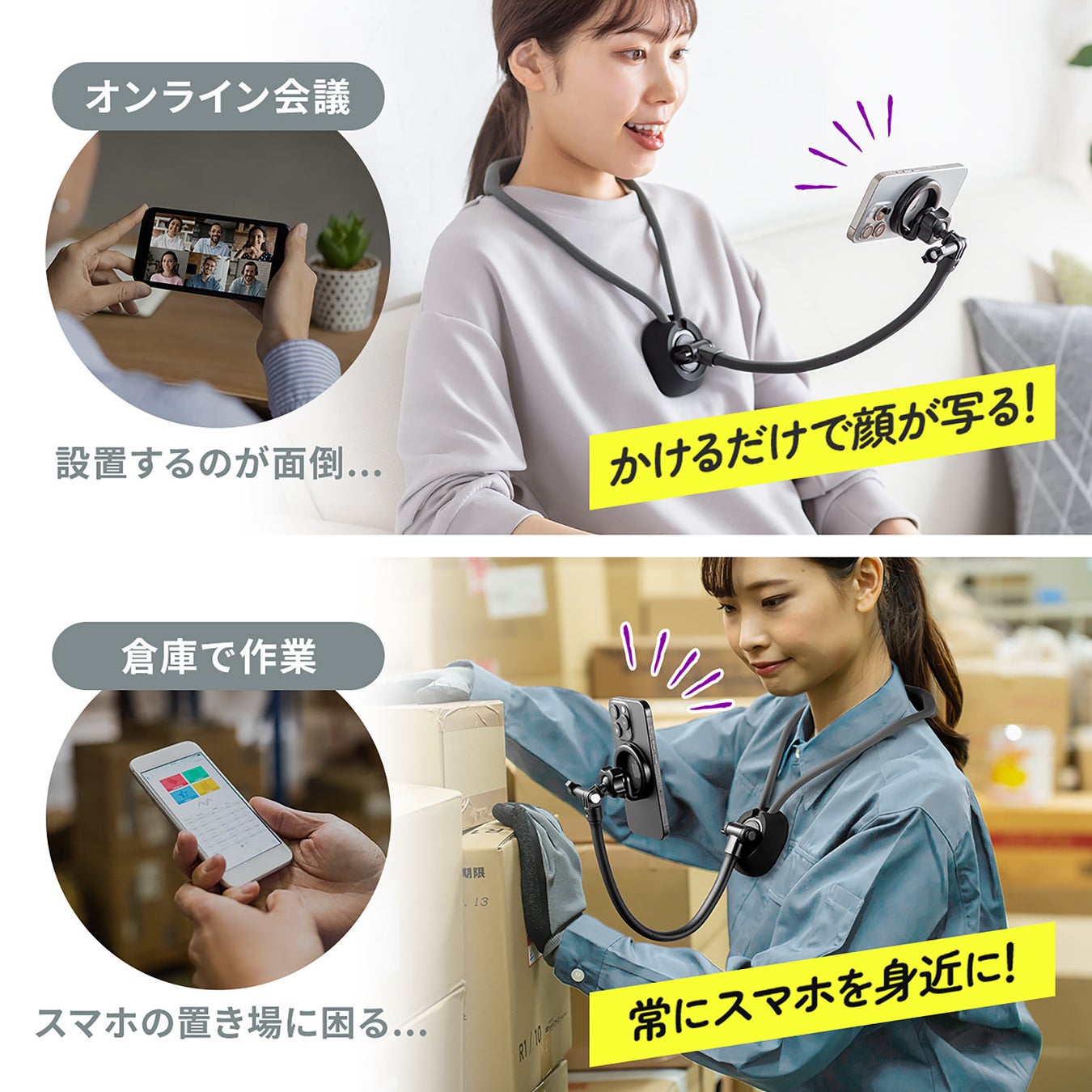 サンワサプライ株式会社(本社:岡山市北区田町1-10-1、 代表取締役社長 山田 和範)が運営している直販サイト『サンワダイレクト』では、首にかけるだけでどこでもスマホを使用できる首掛けフレキシブルアームスタンド「200-DGCAM040(汎用ホルダー)」と「200-DGCAM041(MagSafe対応ホルダー)」を発売しました。