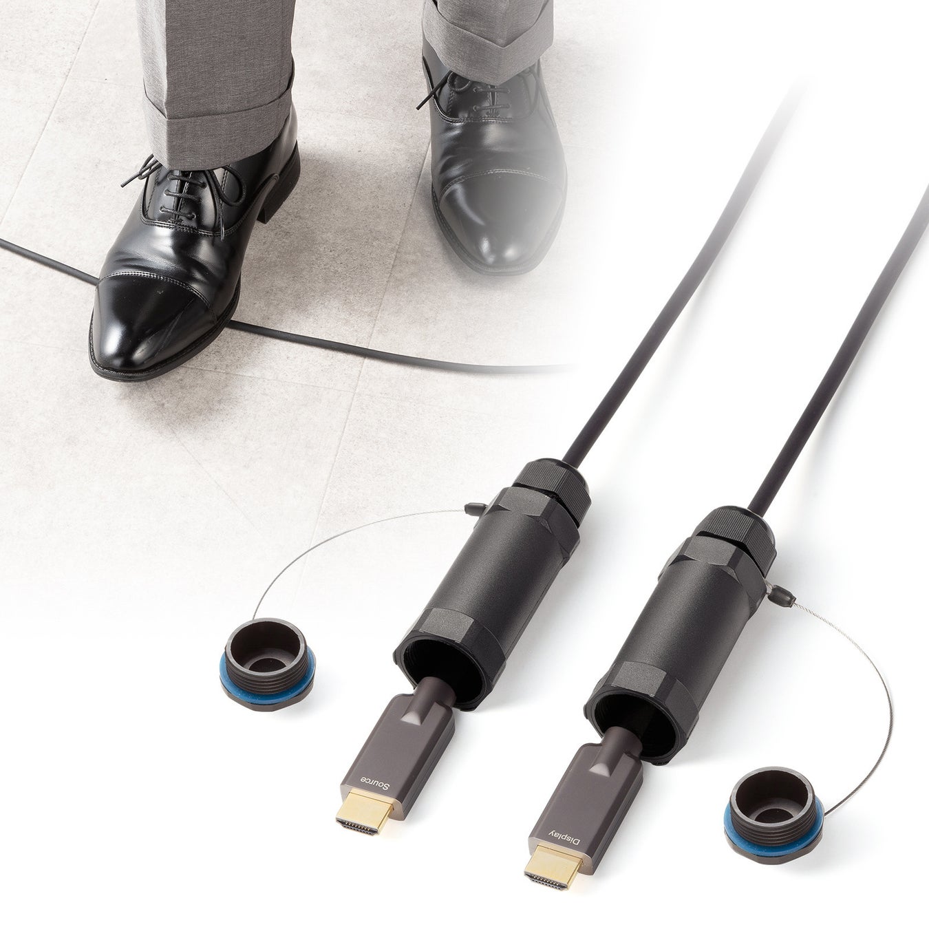 ステンレスガードと防水カバーを備えた本製品は、潜在的な危険の存在する環境での使用に最適です。解像度8K/60Hz、4K/120Hz、伝送速度 48Gbpsに対応したHDMI光ファイバケーブルです。