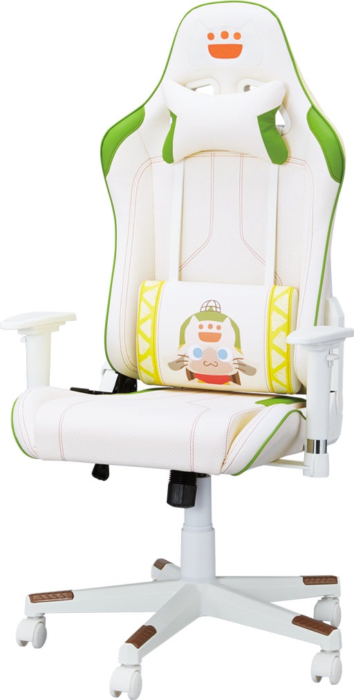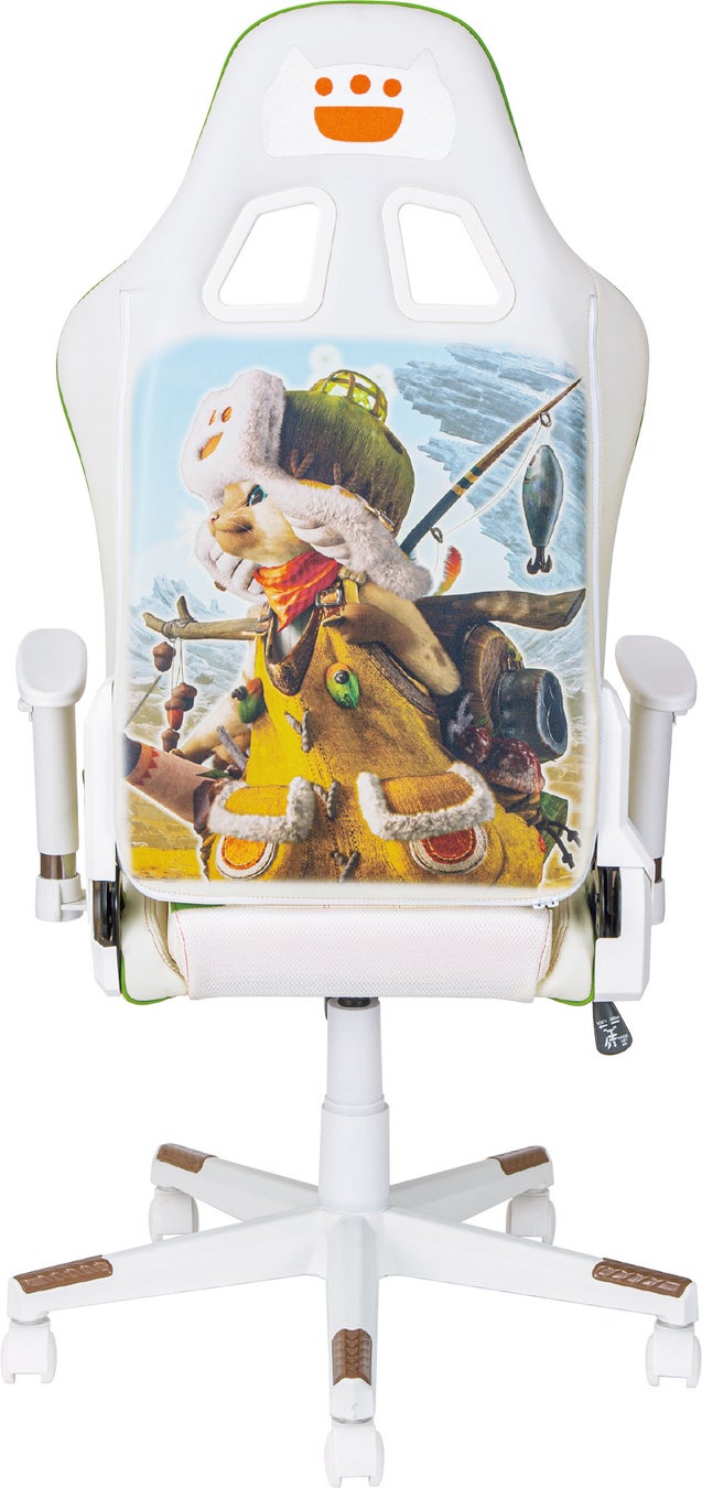 ハンターの相棒「オトモアイルー」のアートやアイコン、ゲーム内で身に着けている帽子のかわいい肉球模様をデザインに取り入れたゲーミングチェア。