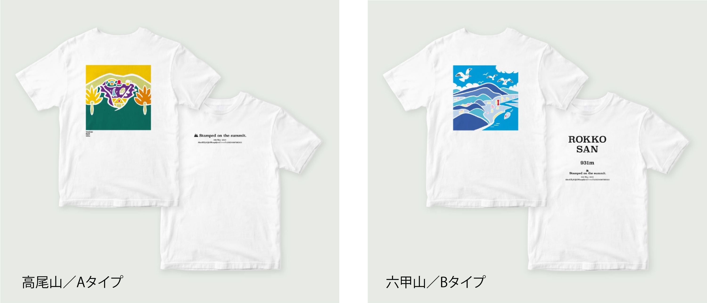 ラインアップは、白馬岳、槍ヶ岳、八ヶ岳、谷川岳、雲取山、丹沢山、六甲山、高尾山の8種類。背中側に大きく絵柄を配置したバックプリントデザインで、正面に「Stamped on the summit」の文字が書かれたAタイプと、山名が書かれたBタイプの2種類があります。Tシャツカラーは6種類から選ぶことができます。