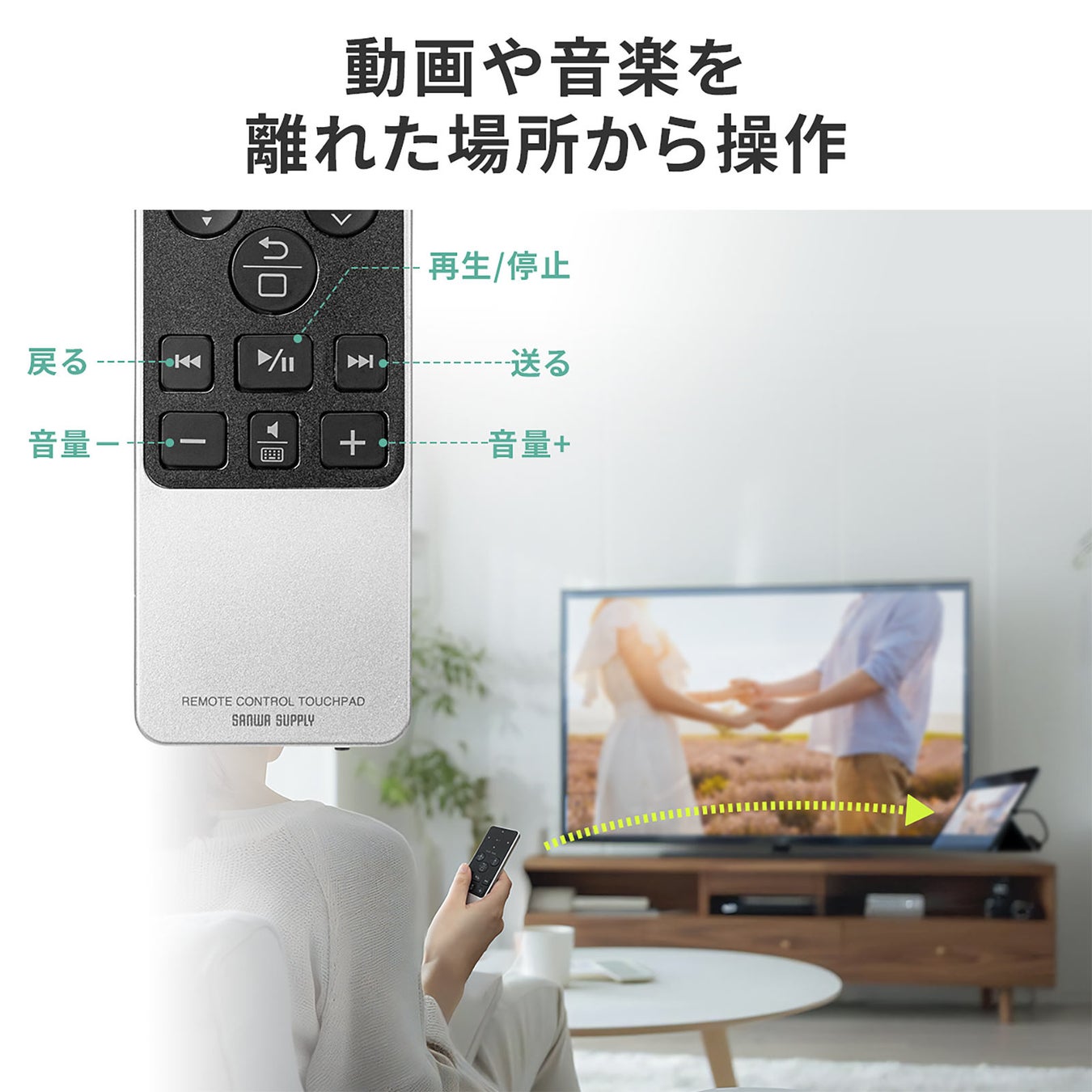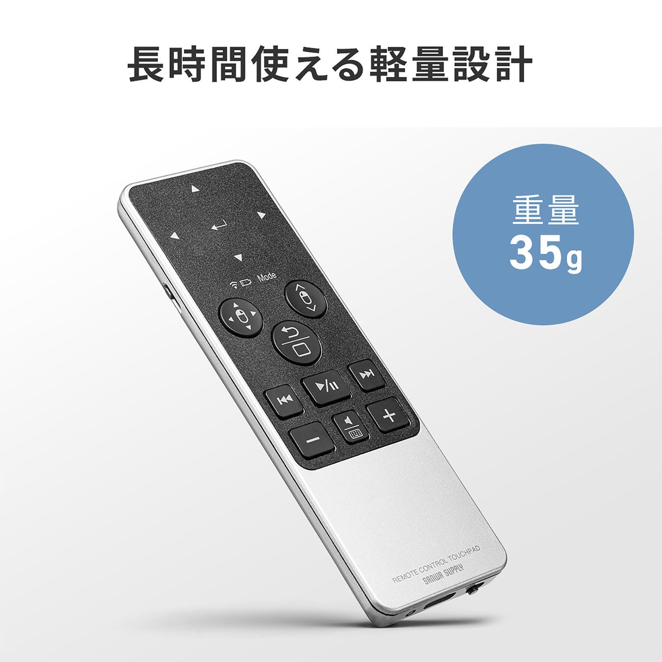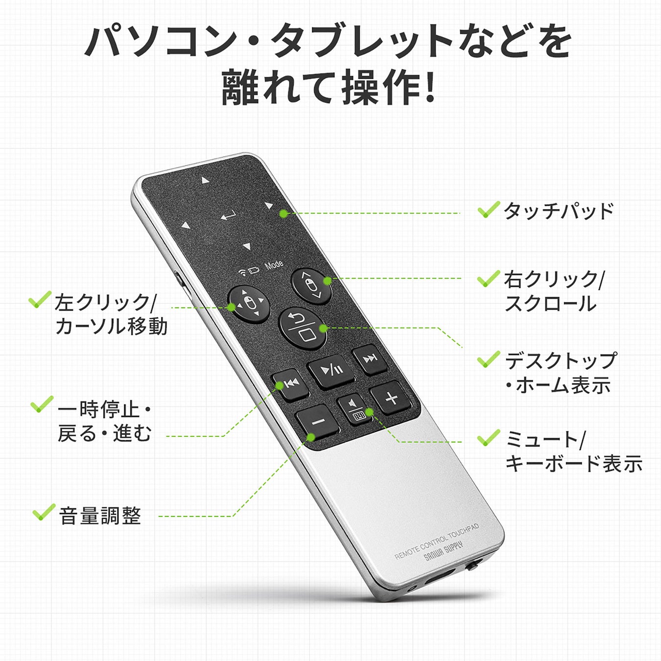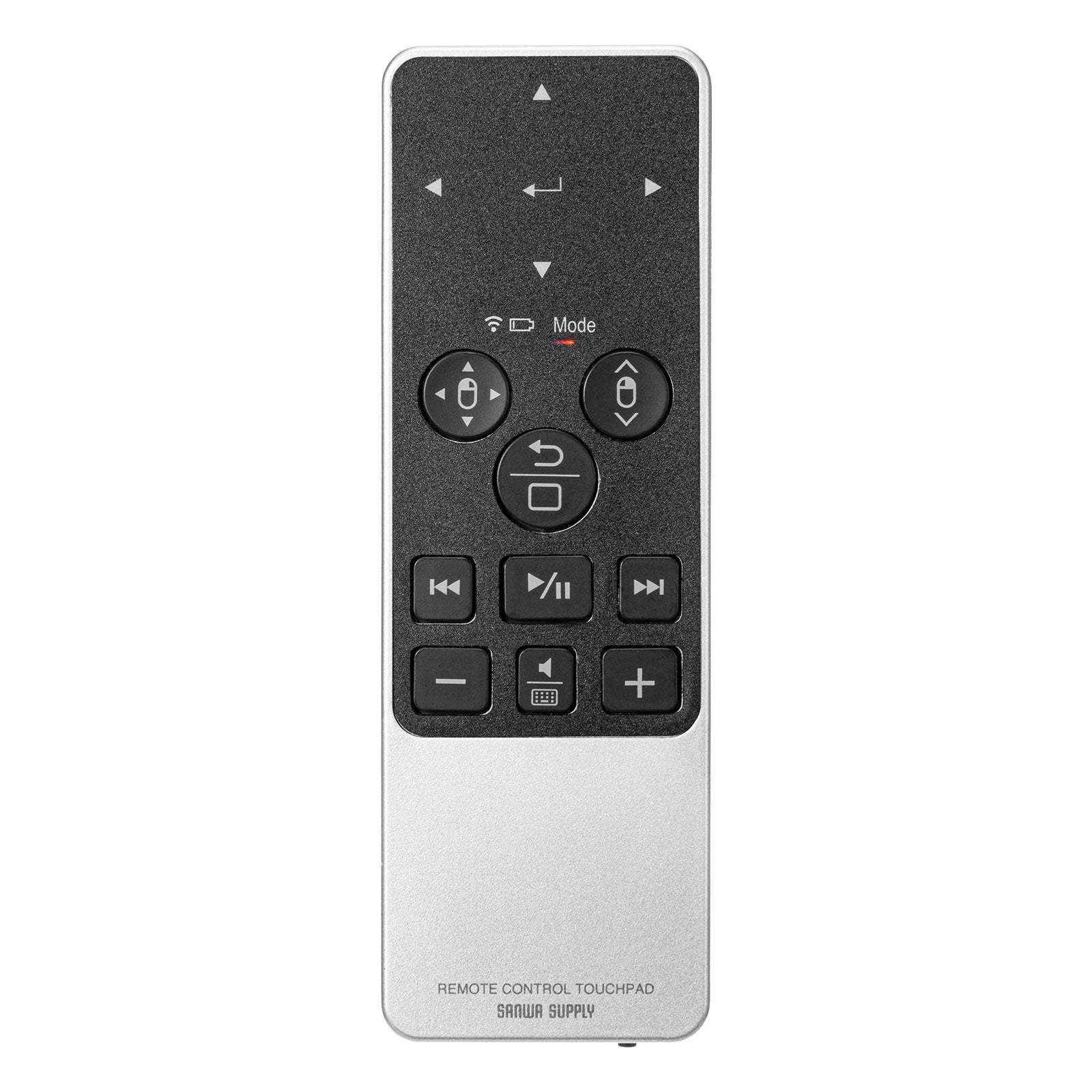 指先でカーソル操作が行え3つのモードを選択できるタッチパッドやメディア操作キー搭載で、パソコン・タブレットなどを離れて操作ができるリモコンマウス