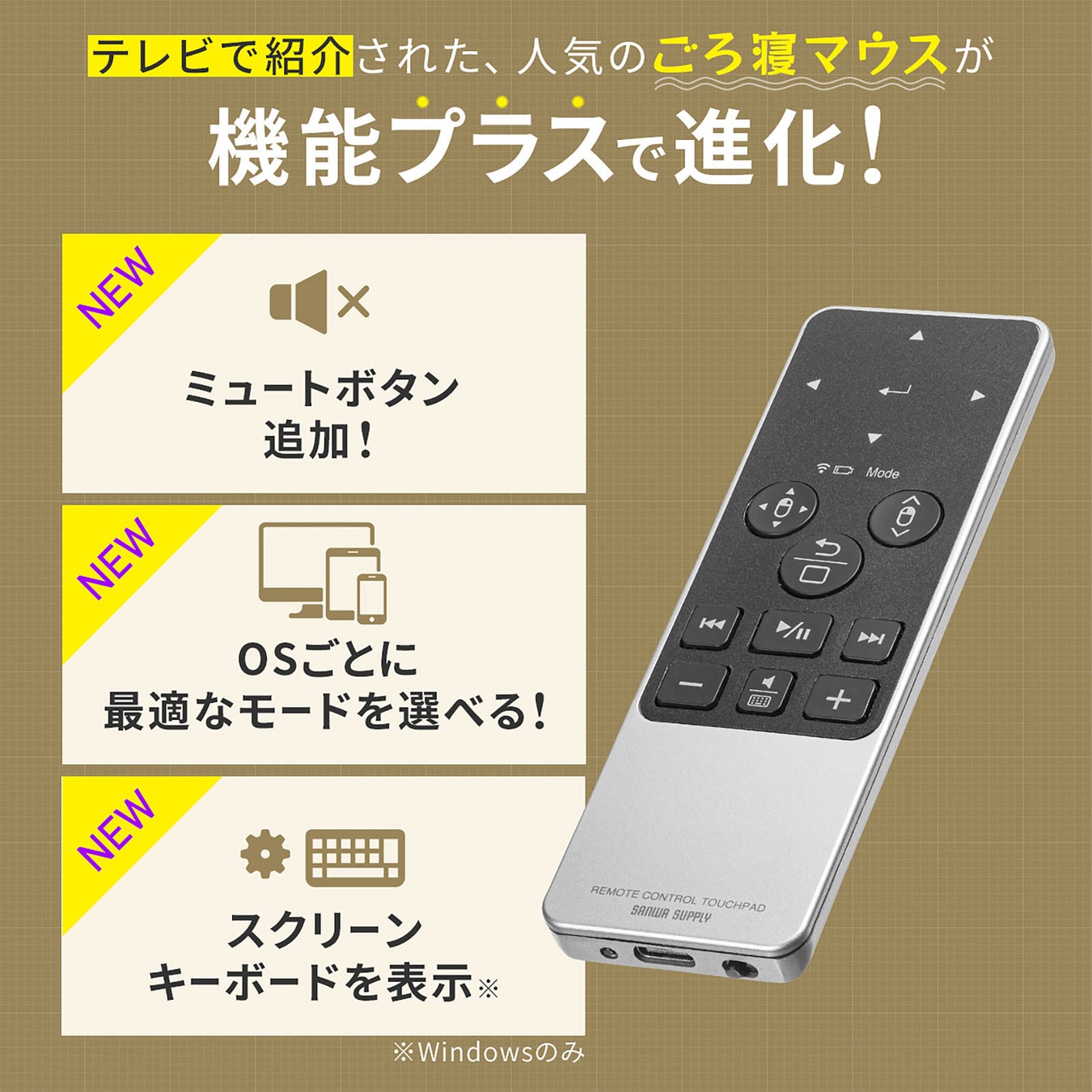 人気のごろ寝マウスに「ミュートボタン」「OS切り替え」「スクリーンキーボード表示」の3つの機能プラスし進化して登場。使い勝手が向上し、より快適にパソコン・タブレットなどを離れて操作可能になりました。