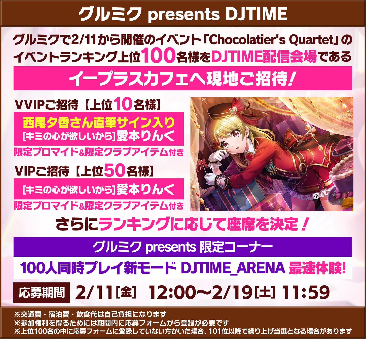 - イベントランキング上位100名様を「グルミク presents DJTIME」にご招待!