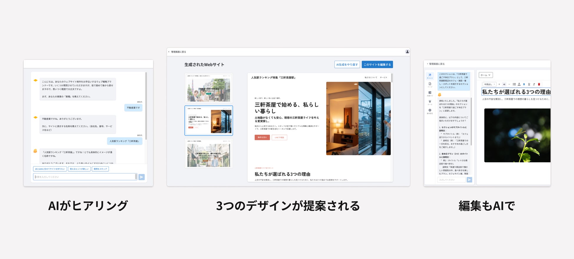 本プランの利用により、デザインやコーディングなどの専門知識がなくても、店舗・企業サイトや個人のポートフォリオなど、用途を問わずAIが構成・デザイン・コンテンツを自動で生成し、そのまま公開することができます。