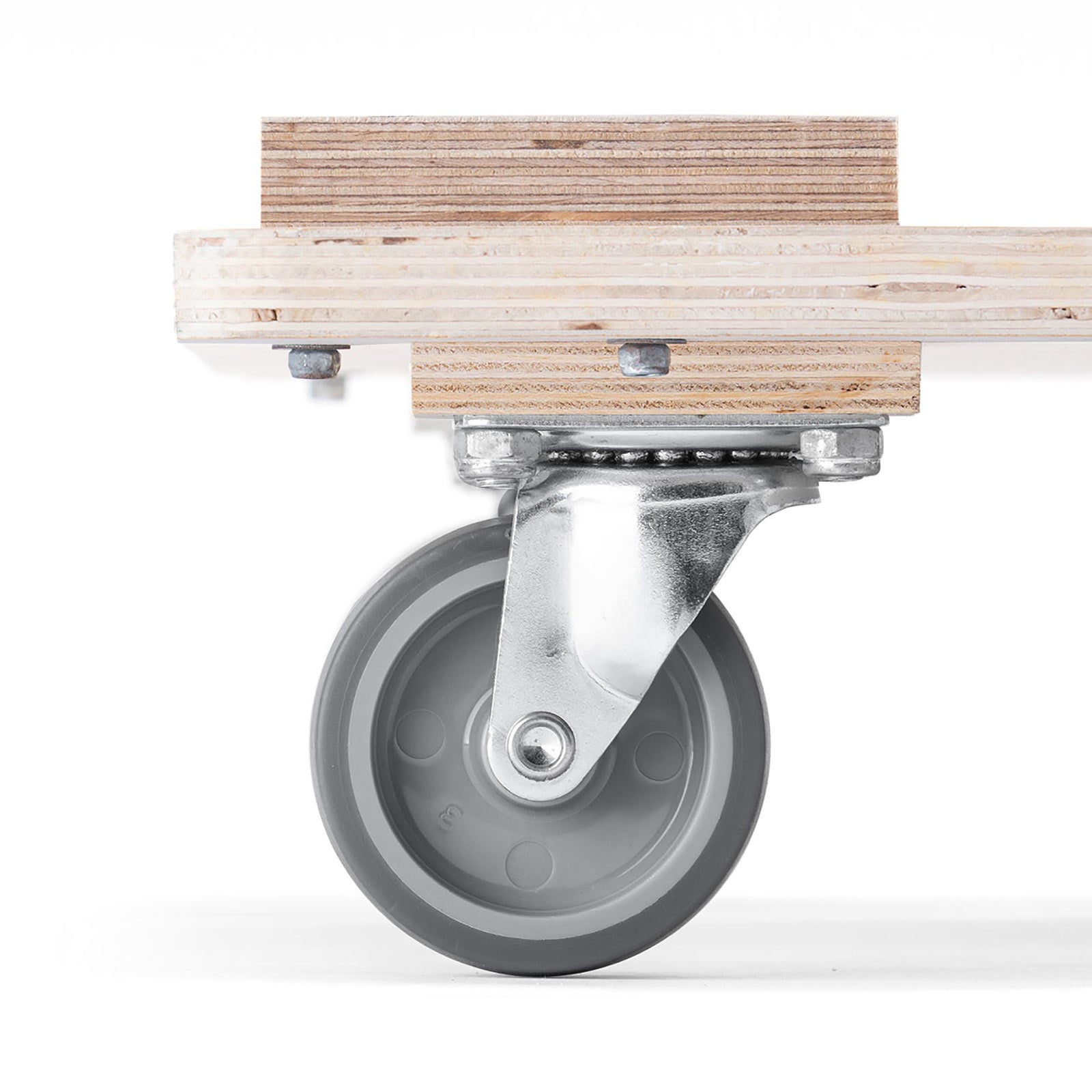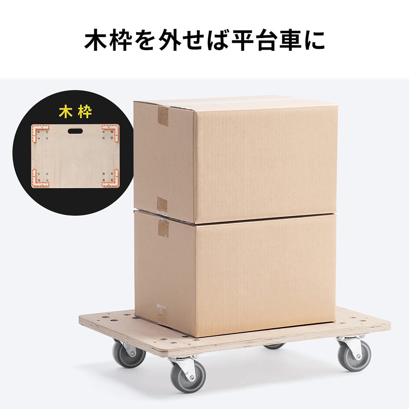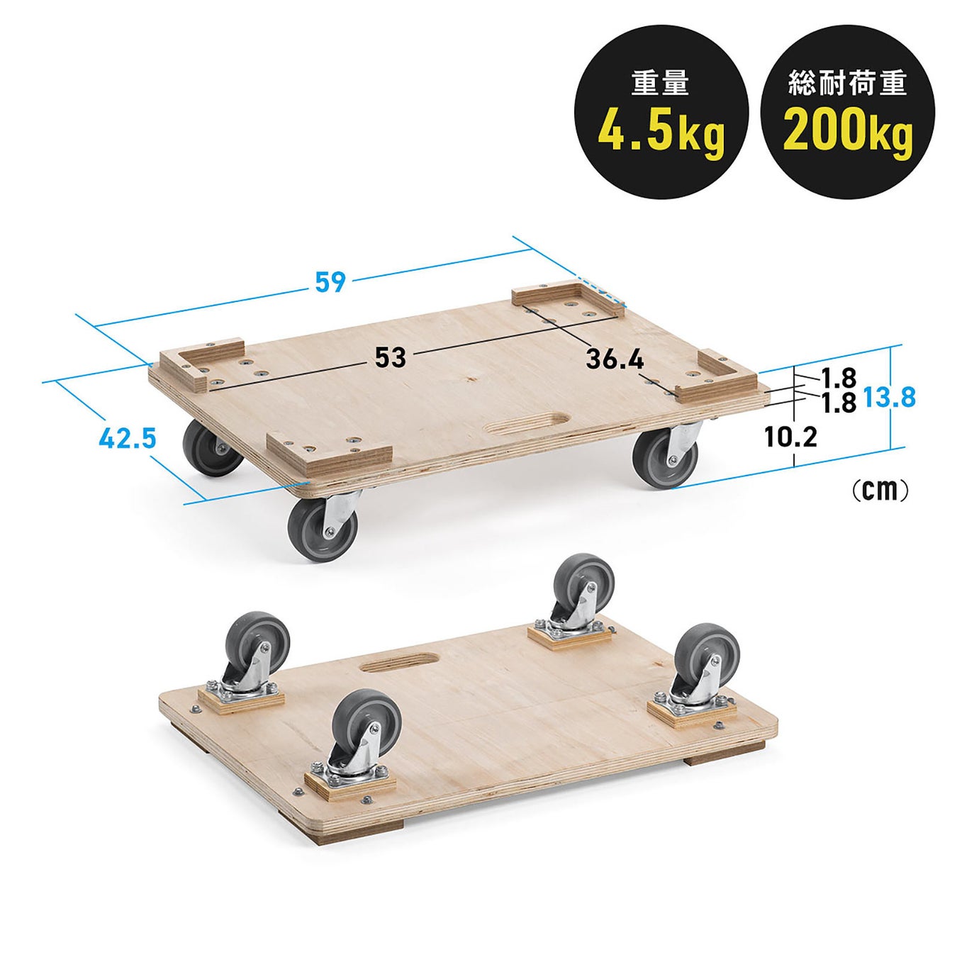 木製でありながら耐荷重は200kgと高耐荷重。大きい物の運搬やタイヤなどの他にも使用することが出来ます。また、荷台板の厚みは1.8cmとしっかりした厚みの板を採用しており、安心して運搬をすることが出来ます。