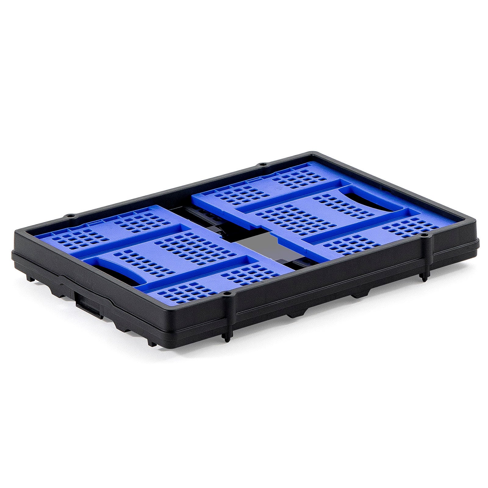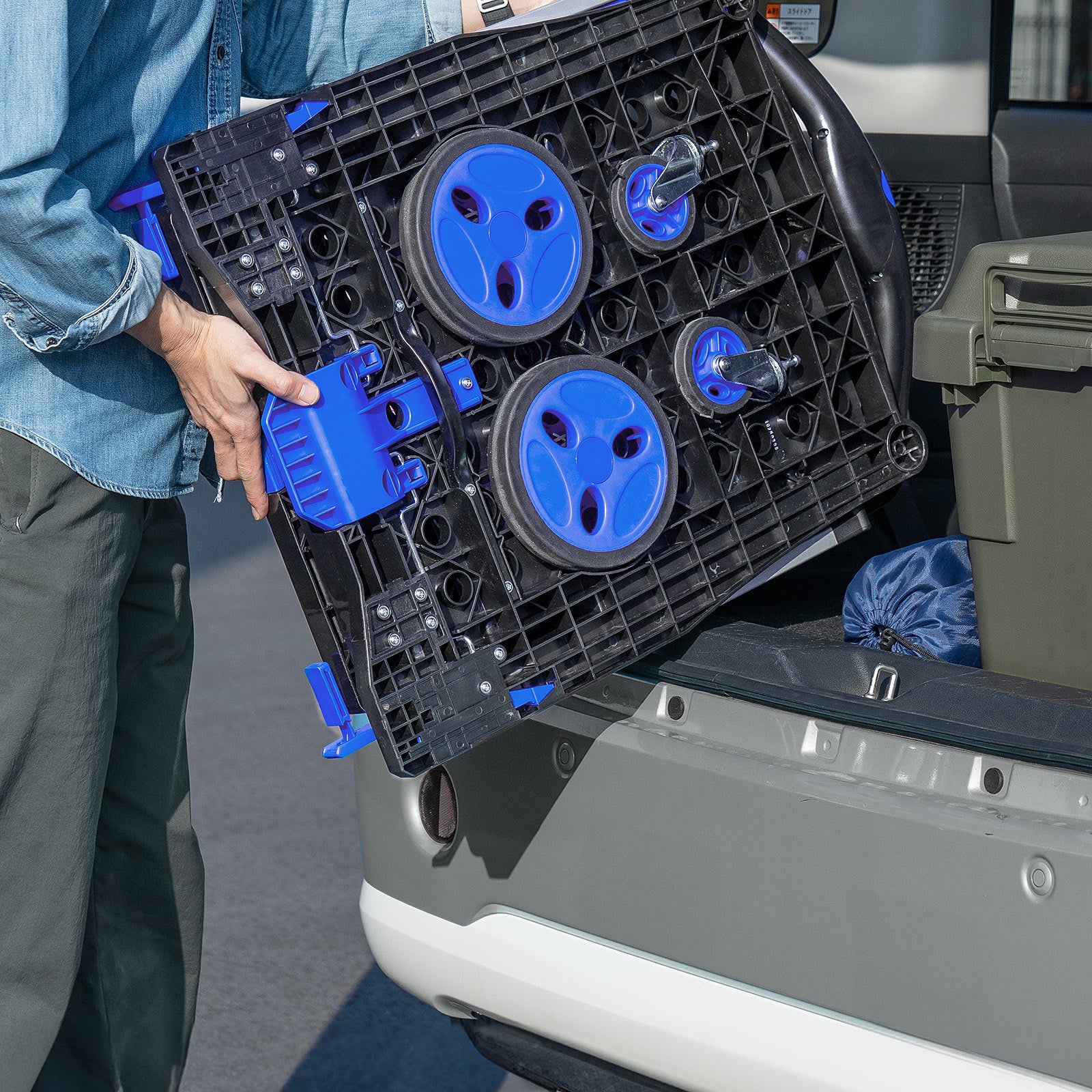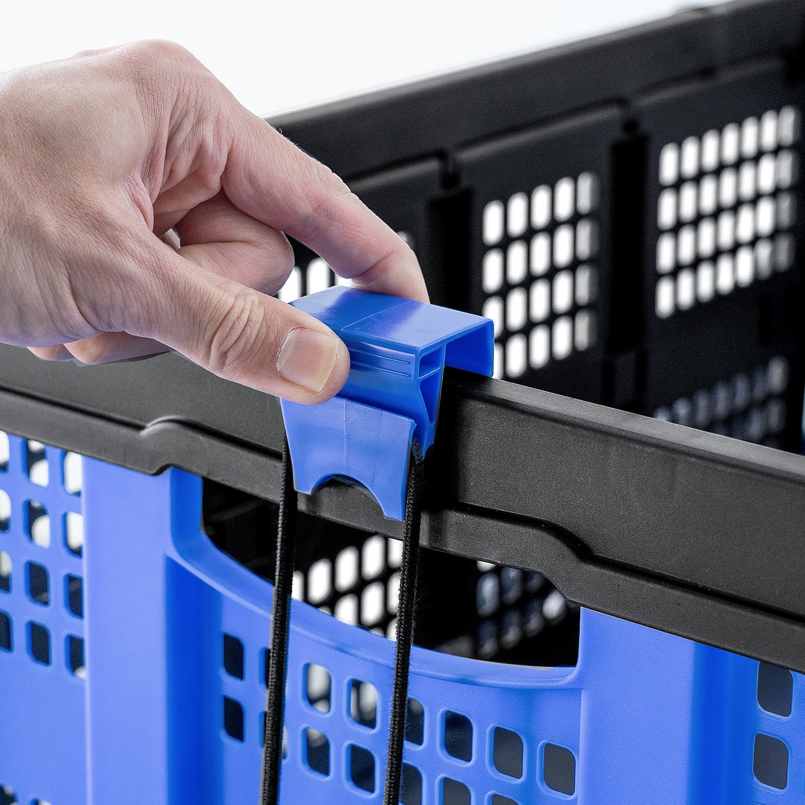 付属の専用コンテナは、折りたたみ可能で省スペース。上段にしっかり固定できるフック付きで、移動中もズレにくい構造です。別売りの専用コンテナを追加すれば、スタッキングも可能。すぐに使える「即戦力ツール」として、業務の即効改善に役立ちます。