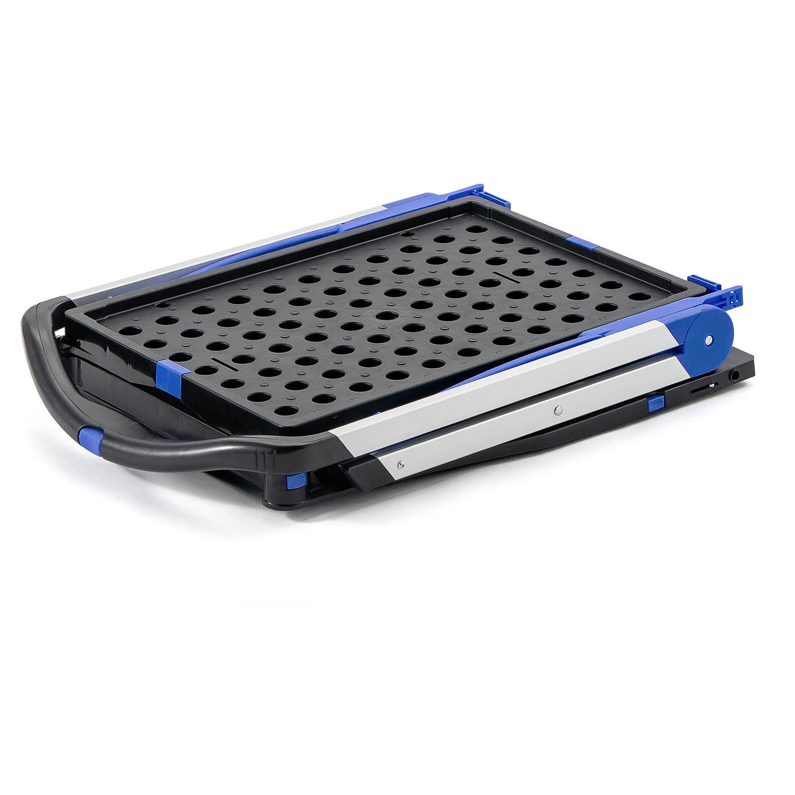 使わないときはわずか約18cmの薄さに折りたため、狭いスペースにもすっきり収納できます。専用の自立スタンドを広げれば、縦置きでの保管も可能。現場でも倉庫でも収納性の高さが際立ちます。
