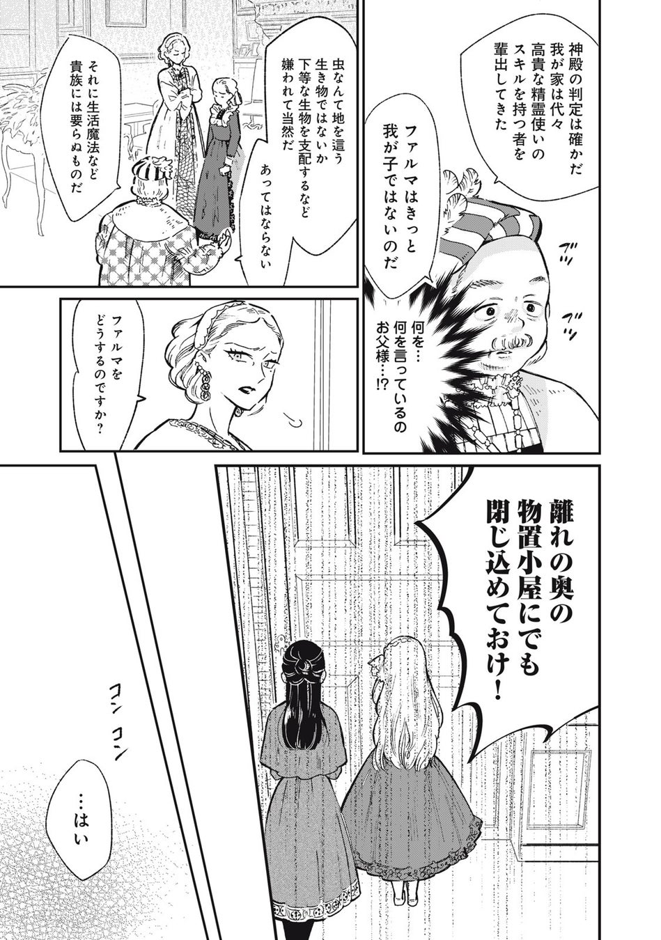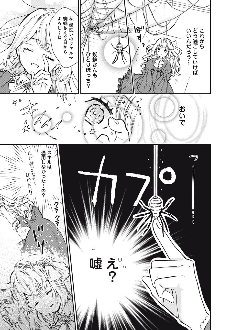 代々、精霊召喚のスキルを得たきたヘルクヴィスト伯爵家の令嬢ファルマは、10歳になり蟲使いのスキルを得たことで、両親から失望され幽閉される。