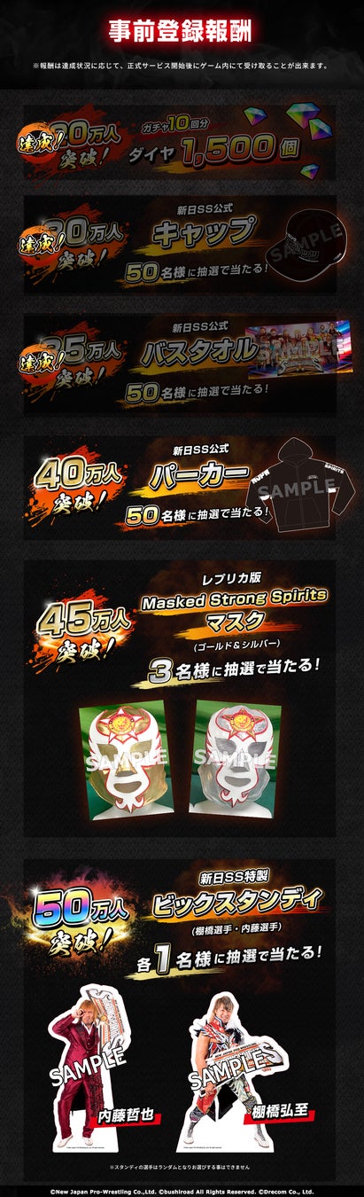 株式会社ブシロード(本社:東京都中野区、代表取締役社長:橋本義賢)は、株式会社ドリコム(本社:東京都品川区、代表取締役社長:内藤 裕紀)が、共同開発しているスマートフォンゲームアプリ『新日本プロレスSTRONG SPIRITS』(以下、新日SS) にて事前登録者数が35万人突破して事前登録者数報酬の30万人と35万人の記念報酬のプレゼントが確定した事をお知らせ致します。ぜひ貴社媒体にてお取り扱い頂きますよう何卒よろしくお願い申し上げます。