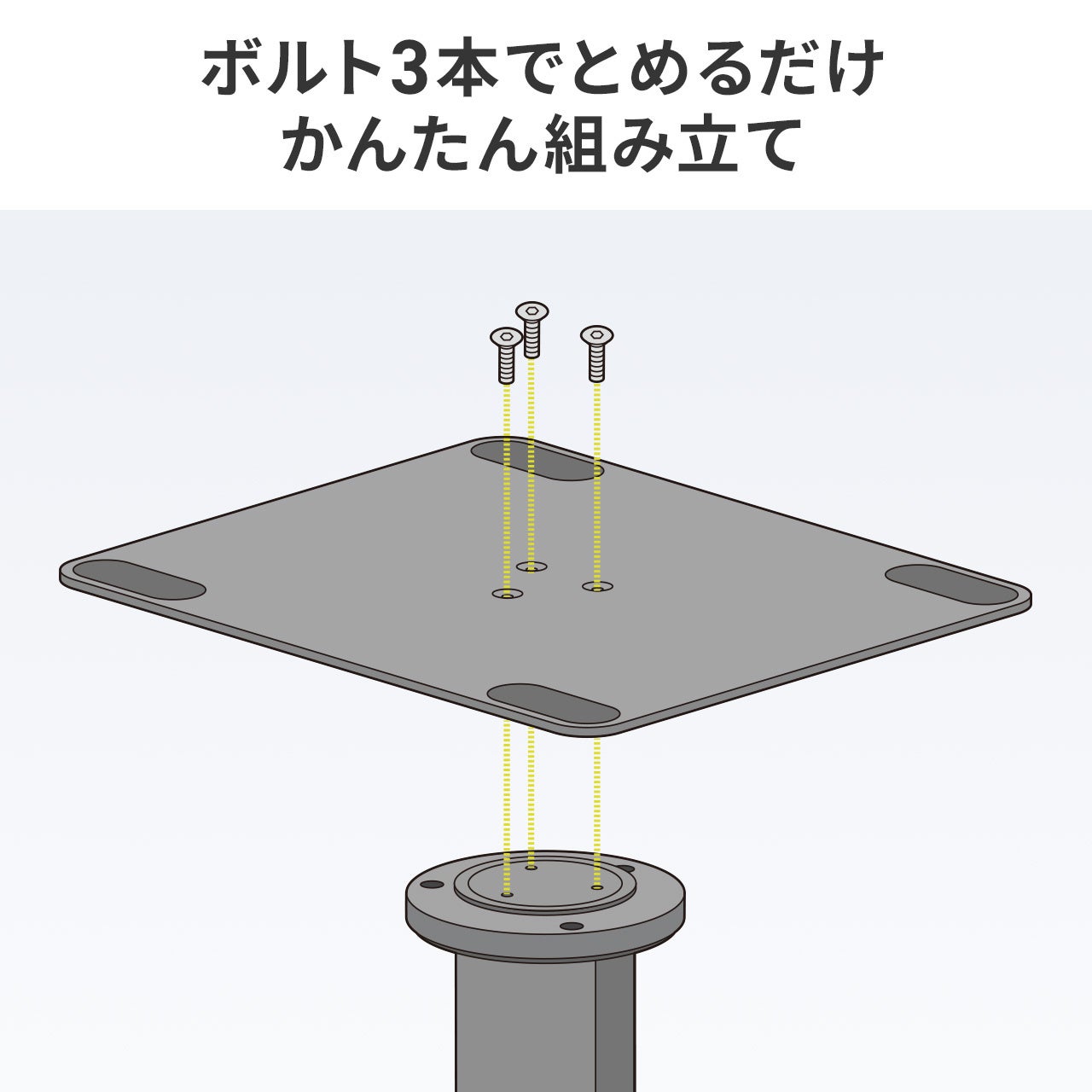 耐荷重は5kgです。安定感のある薄型の台座を使用しています。3本のボルトで台座と支柱を取り付けるだけの簡単組立です。