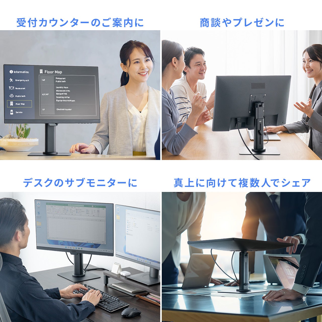 支柱が360度回転し自由に角度を調整できます。画面を上方向に180度回転でき反対側に画面の向きを変えることができます。