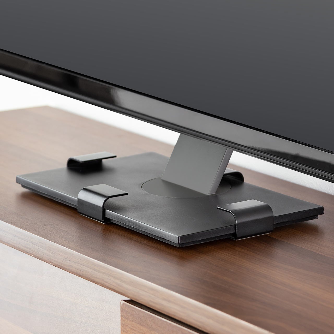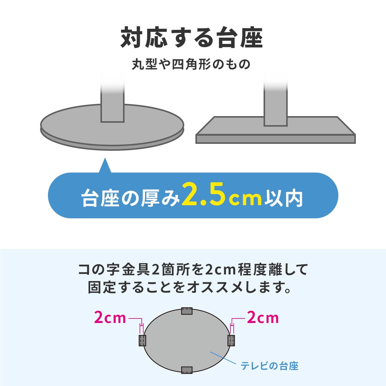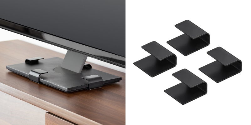 リビングのテレビだけでなく、ご自宅のパソコン用大型モニターにも対応しているのが本製品の特長です。コの字型の金具で設置を行うため、台座が丸型や四角で厚みが2.5㎝以下で65型以下であれば、テレエビやモニターなどでマルチに設置が可能です。