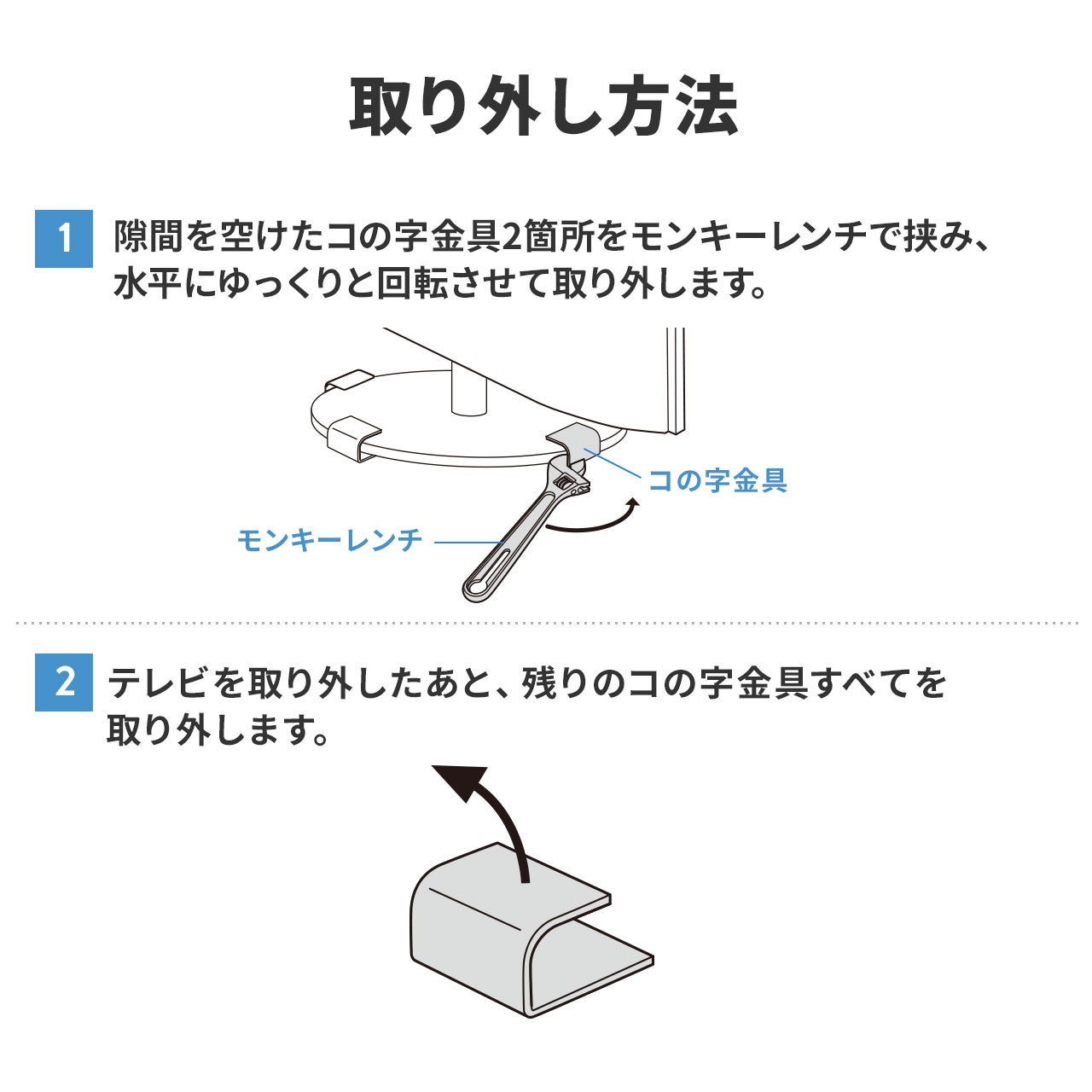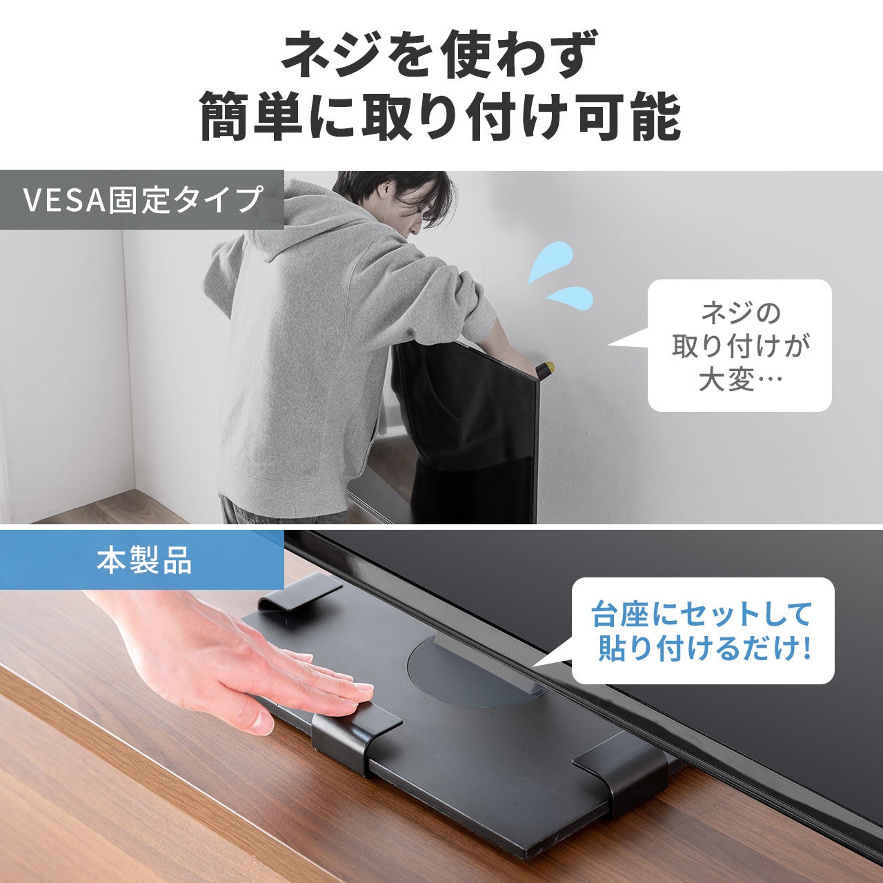 リビングの主役である大型テレビや、仕事や趣味に欠かせない大型モニターは、地震などで転倒すると危険なだけでなく、高額な買い替えコストが発生します。この商品は65型までの大型テレビをしっかりと固定。コの字型の金具により、テレビの台座部分をしっかりとホールドできます。