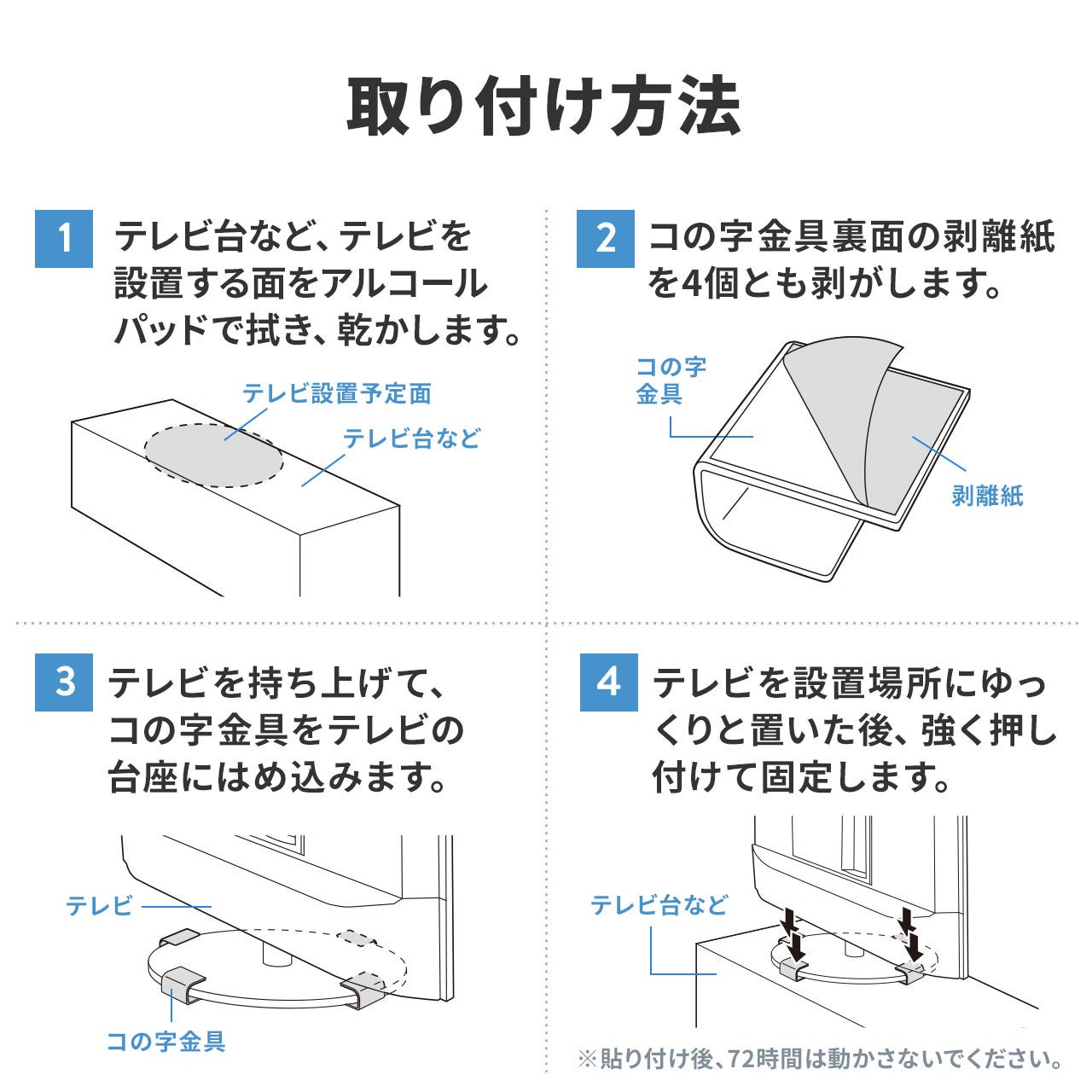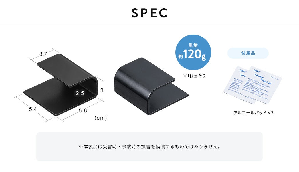 「防災グッズは必要だけど、取り付けが面倒...」というお悩みを解決します。本製品は金具に直接両面テープが付いているため、工具不要で誰でも簡単に取り付けられます。面倒な穴あけ作業も不要で、賃貸住宅にお住まいの方でも安心してご使用いただけます。難しい作業は特になしで大切な家電の防災対策ができます。