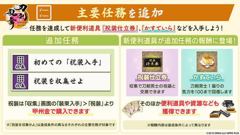 追加となった任務では、達成報酬として刀剣男士の「祝装」の交換に使用できる「祝装仕立券」や、刀剣男士の気力を回復できる「かすていら」を入手できます。