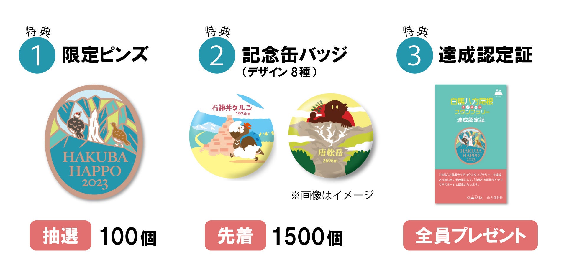 スタンプラリーを達成すると記念缶バッジと達成認定証がもらえるほか、抽選で特製ピンズが当たります。さらに、スペシャルチェックインポイントの唐松岳のスタンプを獲得すると、唐松岳登頂記念缶バッジがもらえます。特典の詳細は「白馬八方尾根ホッピングスタンプラリー」特設サイトをご確認ください。