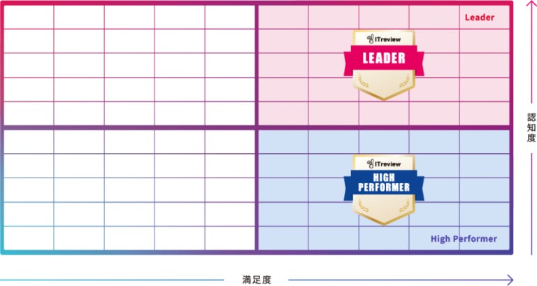 「ITreview Grid」で満足度が高い領域のプロダクトには「High Performer」バッジが発行され、満足度・認知度両方の領域で高い評価を得たプロダクトには「Leader」バッジが発行されます。