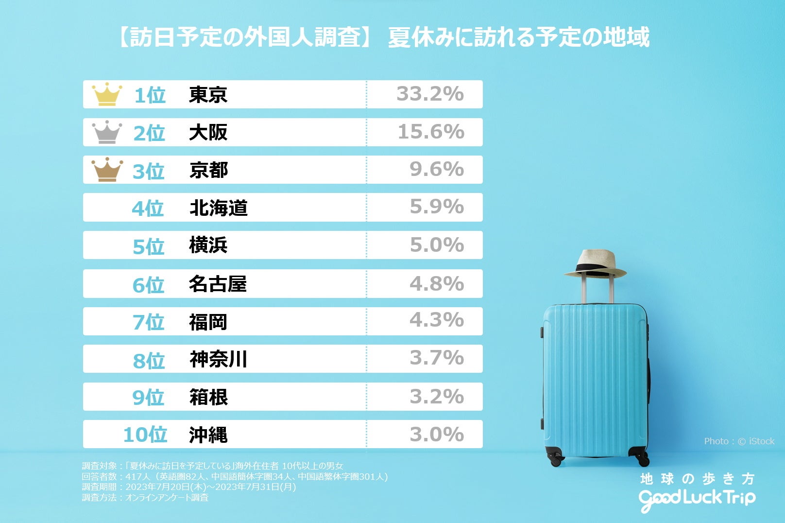 「2023年の夏休みに訪日旅行を予定している」外国人417名にアンケート調査を実施。その結果、夏休みの取得時期、期間、訪問を予定している地域、さらにはその地域を旅先に決めた理由が明らかになりました。
