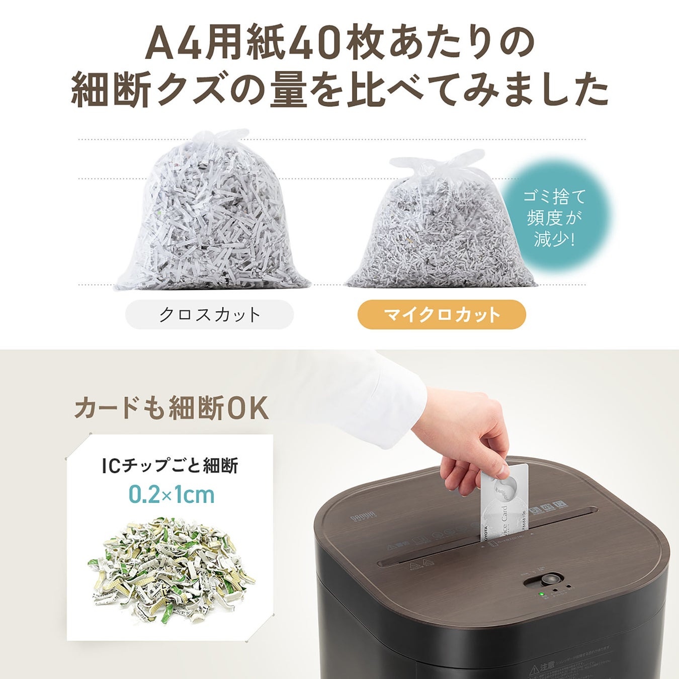 個人情報や機密文書の処分には、細断の細かさが鍵。2×10mmのマイクロカット方式を採用しており、情報漏えい対策として安心。クレジットカードやプラスチック製の会員証なども細かく裁断できるので、書類以外の処分にも対応可能です。