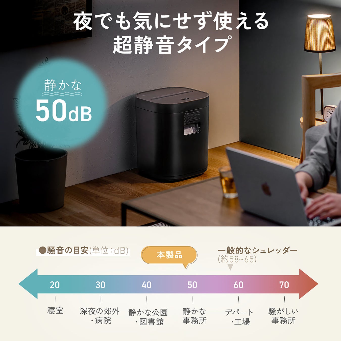 在宅ワークやオフィスでも「音」が気になる場面は多いもの。本製品は約50dBの静音設計で、電話応対や会議中でも気兼ねなく使用できます。シュレッダー特有の大きな駆動音がなく、周囲への配慮を求められる環境に最適です。