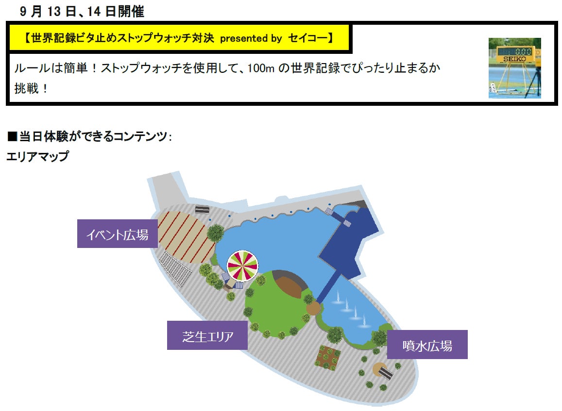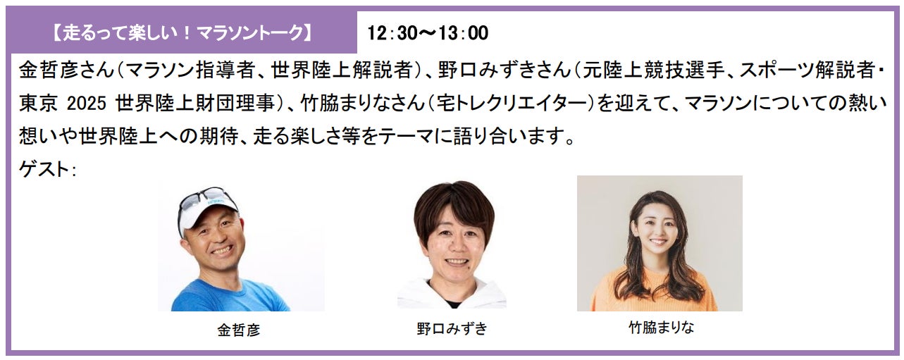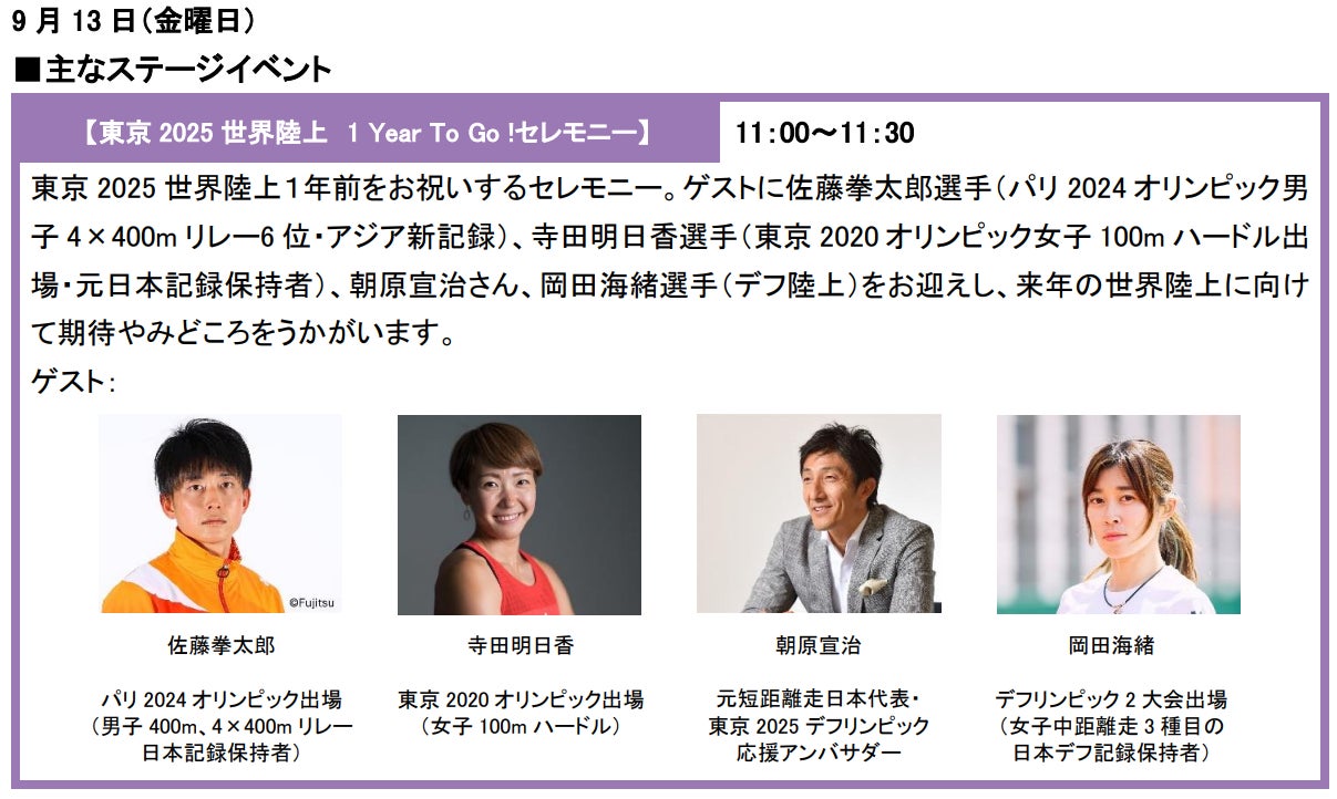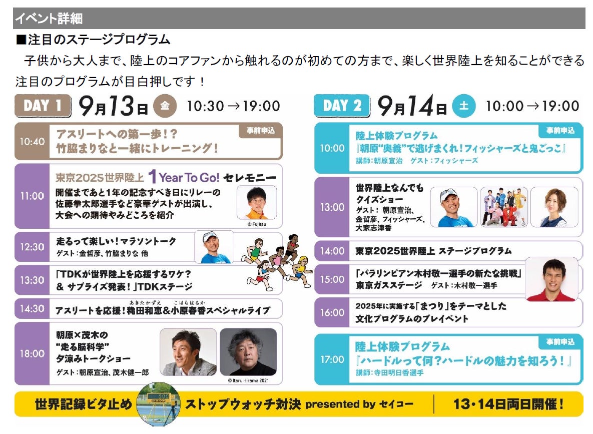 ステージでは、豪華ゲストによる 『東京 2025 世界陸上』の1年前セレモニーを始め、様々なプログラムを用意しています。また、競技用具に実際に触れることが できるブースや、 立ち幅跳びにチャレンジできるブース、そしてARで様々な世界記録を体感できる企画展示など、体験できる内容も充実し ています。