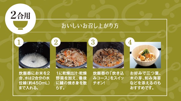 今回、発売する「うなぎ飯の素」は、京料理「直心房さいき」の才木充氏が、常圧凍結乾燥の特長を生かした料理として考案。共に試行錯誤を繰り返した末に商品化した自信作です。「うなぎ飯の素」に含まれる食材は全て常圧凍結乾燥で処理しており、出汁も厨房の出来立ての味と香りを閉じ込めた状態でお届け。お米と一緒に炊飯器で炊き上げるだけで、風味豊かな本格京料理が自宅で簡単に楽しめます。