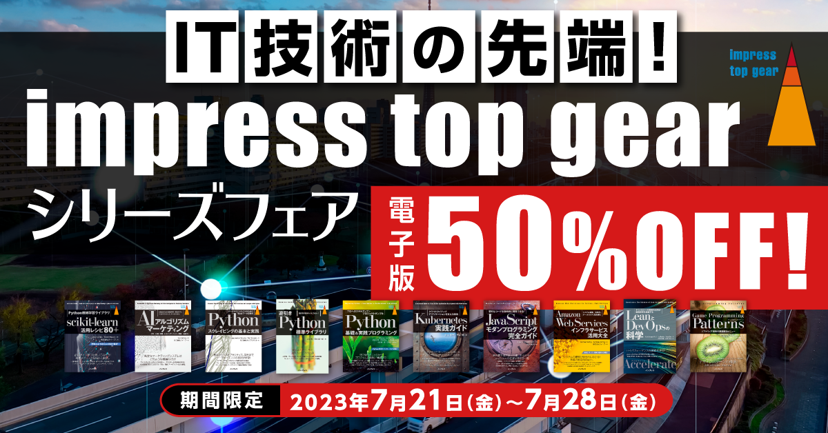「impress top gear」シリーズは、「IT技術の先端」をテーマにした技術解説書です。企画・開発・運用・研究の現場で活躍するエンジニアやプログラマーなどの方々が、最先端の技術を吸収して「トップギア」へとシフトチェンジできる書籍を提供しています。今回、インプレスの直販サイト「インプレスブックス」において、impress top gearシリーズの中から厳選した10タイトルの電子書籍を50%オフで販売いたします。新しい技術を習得したいITエンジニアの方はどうぞお見逃しなく!