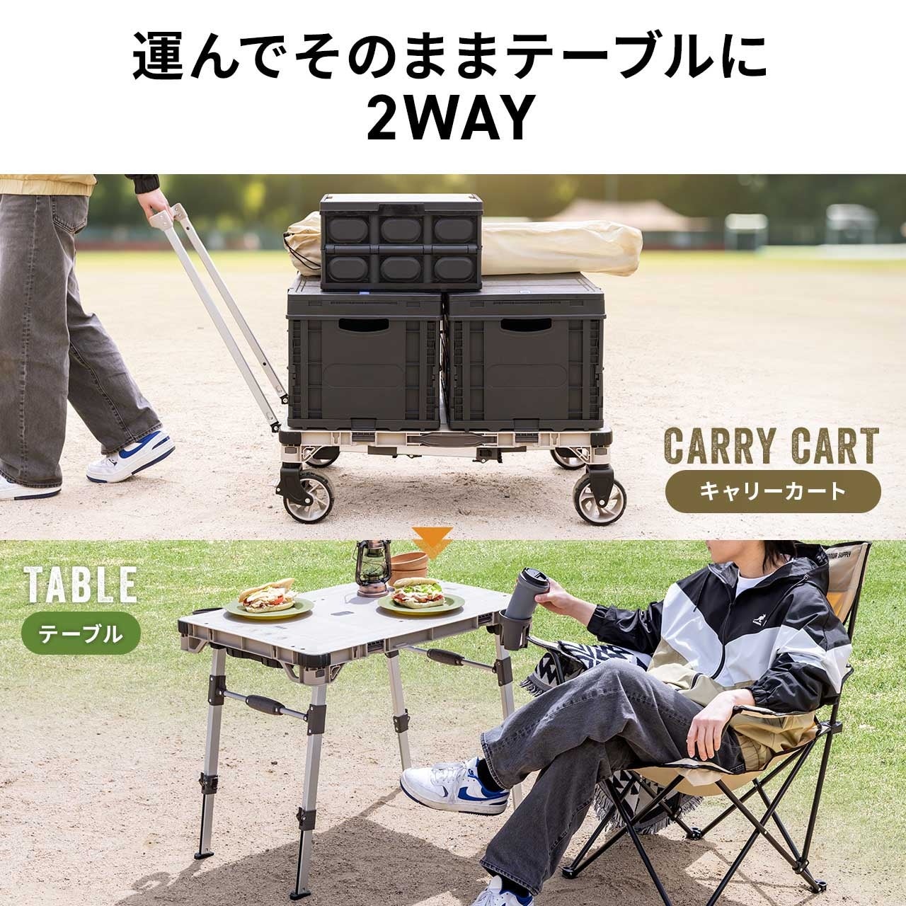 キャリーカート & アウトドア テーブル 耐荷重100kg 折りたたみ 2WAY 多機能 高さ調整 4輪 ハンドル付き ベージュ