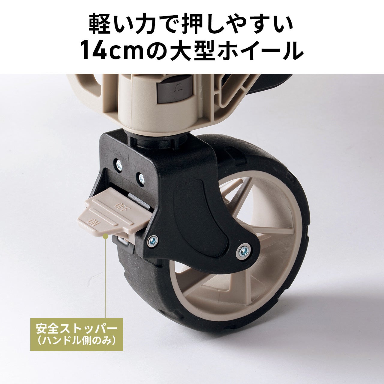 ●軽い力で運べる、アウトドアに適した14cmの大型ホイールキャスターで、安全ストッパーもついています。