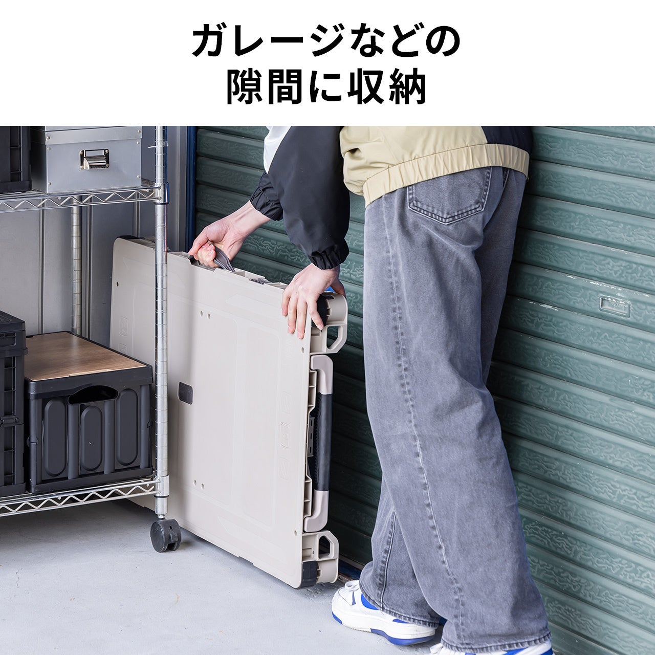 ●折りたたみコンテナ(100-CNV001CV)が2つ載せられるサイズで、本製品にピッタリはまる溝があり、動かしてもズレなくなっています。