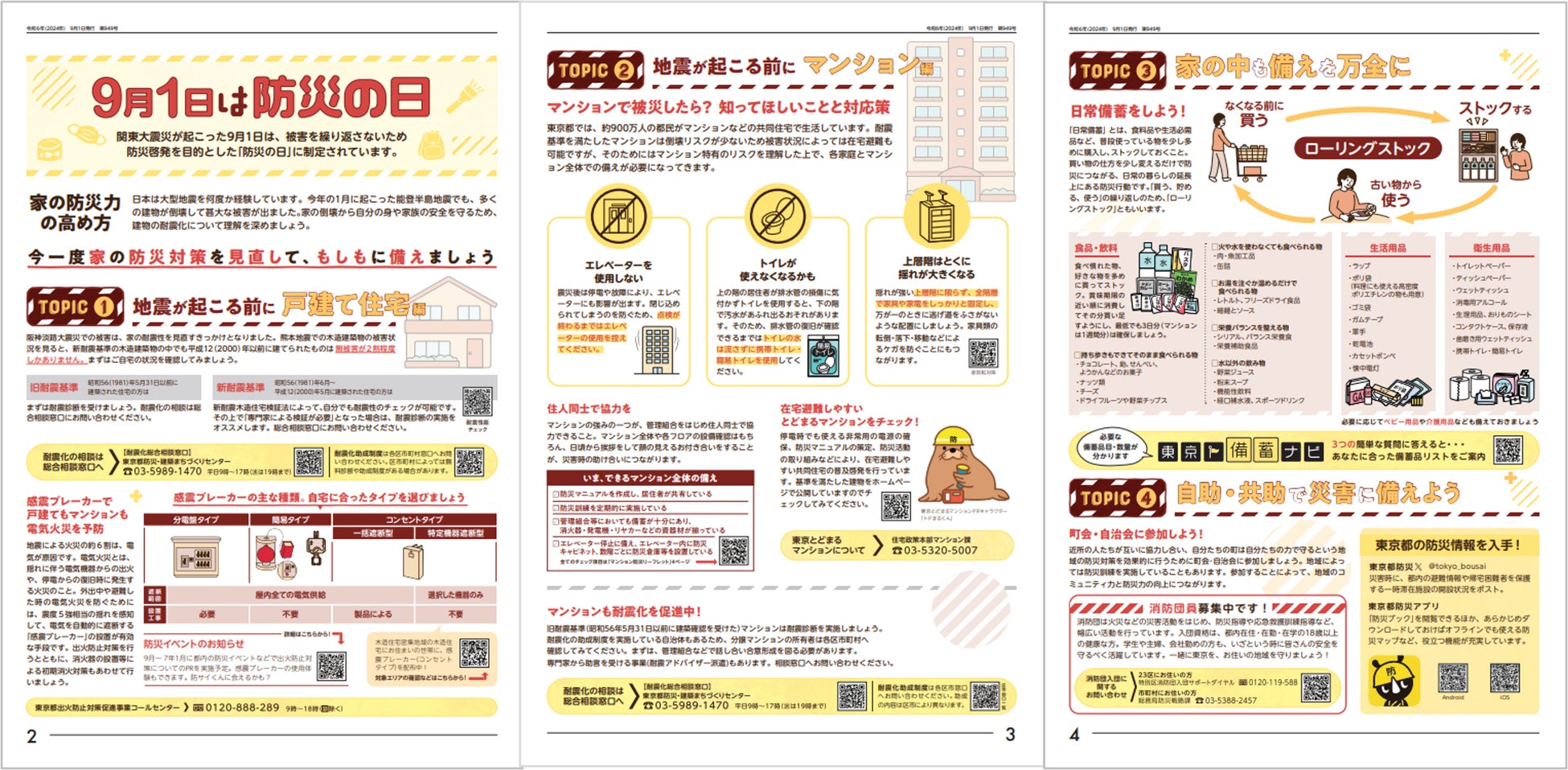 東京都では、都政や都民生活に必要な情報を伝えるため、広報紙「広報東京都」を毎月1日に発行しています。9月号は「防災」がテーマ。今年1月の能登半島地震でも、多くの建物が倒壊して甚大な被害が出ました。また、8月8日には日向灘を震源とする地震があり、南海トラフ地震臨時情報も発表されました(8月15日呼びかけ終了)。大型地震への懸念が高まっているこのときに、自分や家族の安全を守るため、建物の耐震化や日頃から備えられることなどを紹介します。