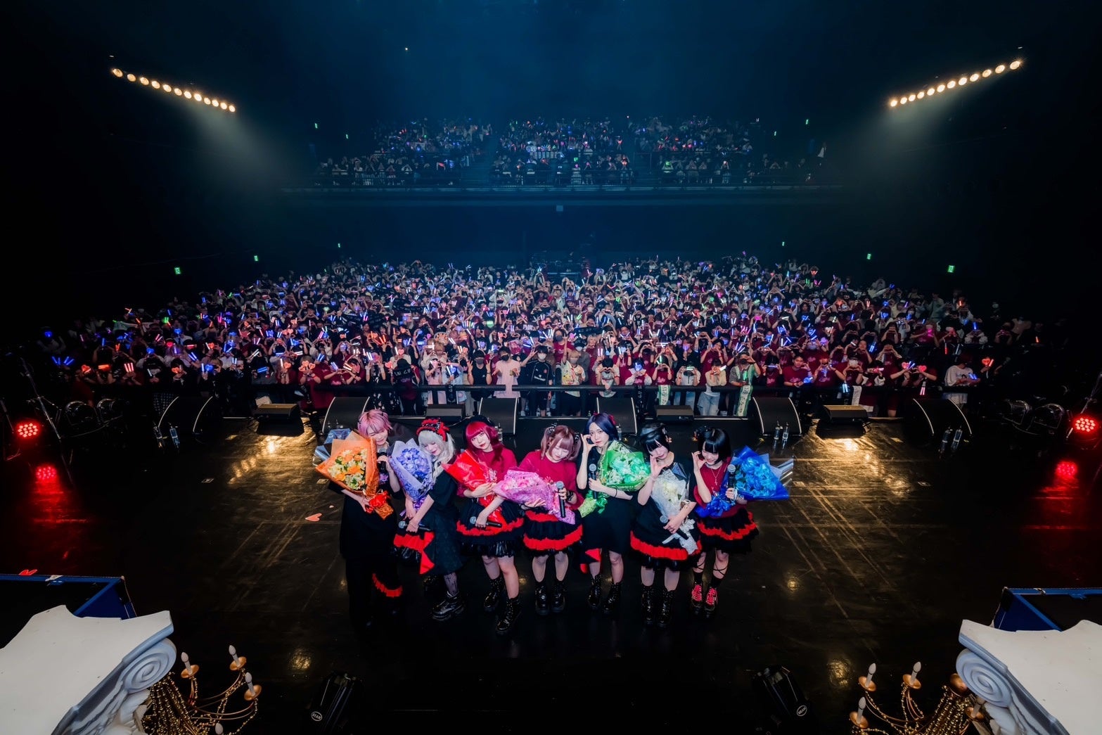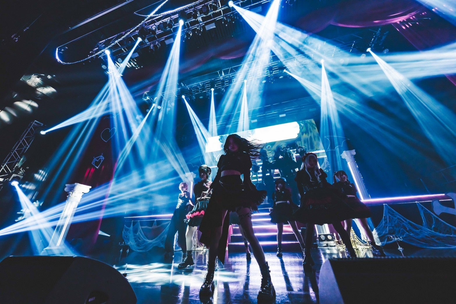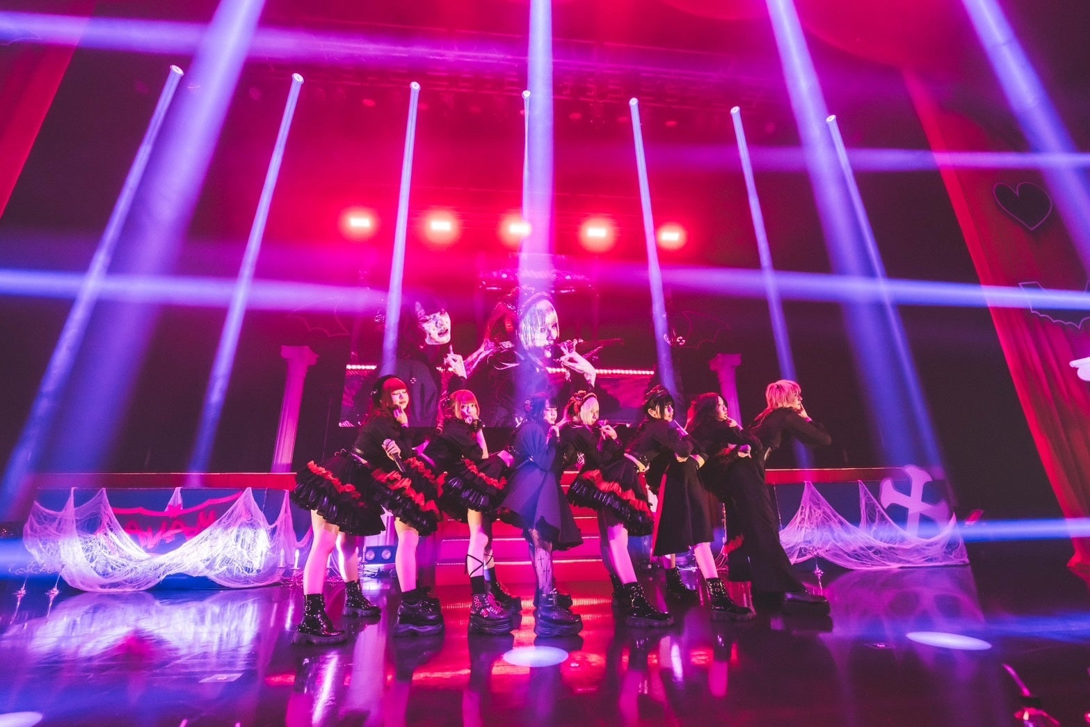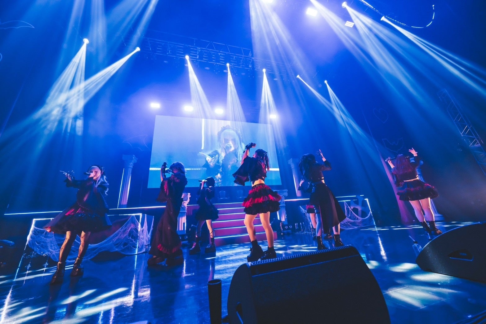 ステージ上にはコウモリや十字架など、ゴシックホラーの洋館のようなセットが広がっていた。これまでにない大規模なセットに世界観のこだわりが見られ、“1周年”の本気を感じる。