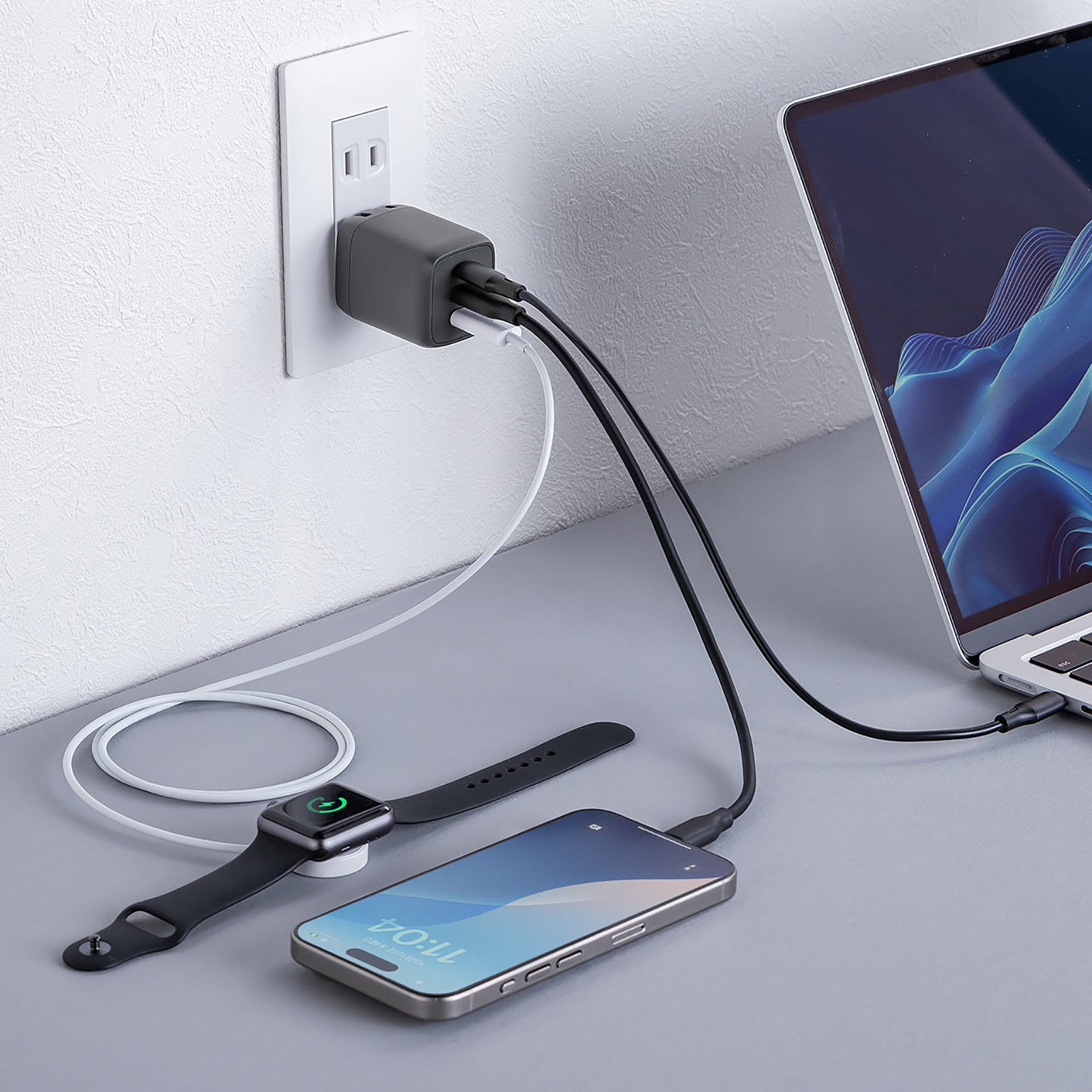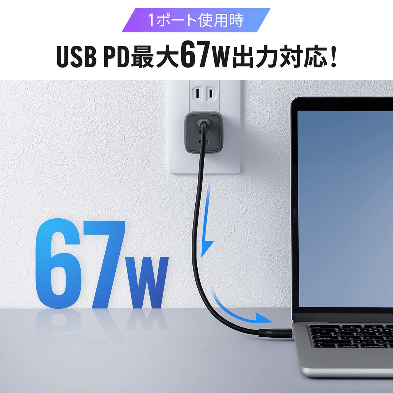 USB Power Delivery規格に対応し、1ポート使用時は最大67Wの高出力を実現。一般的なノートパソコンはもちろん、タブレットやスマートフォンもこれ1台で急速充電可能です。