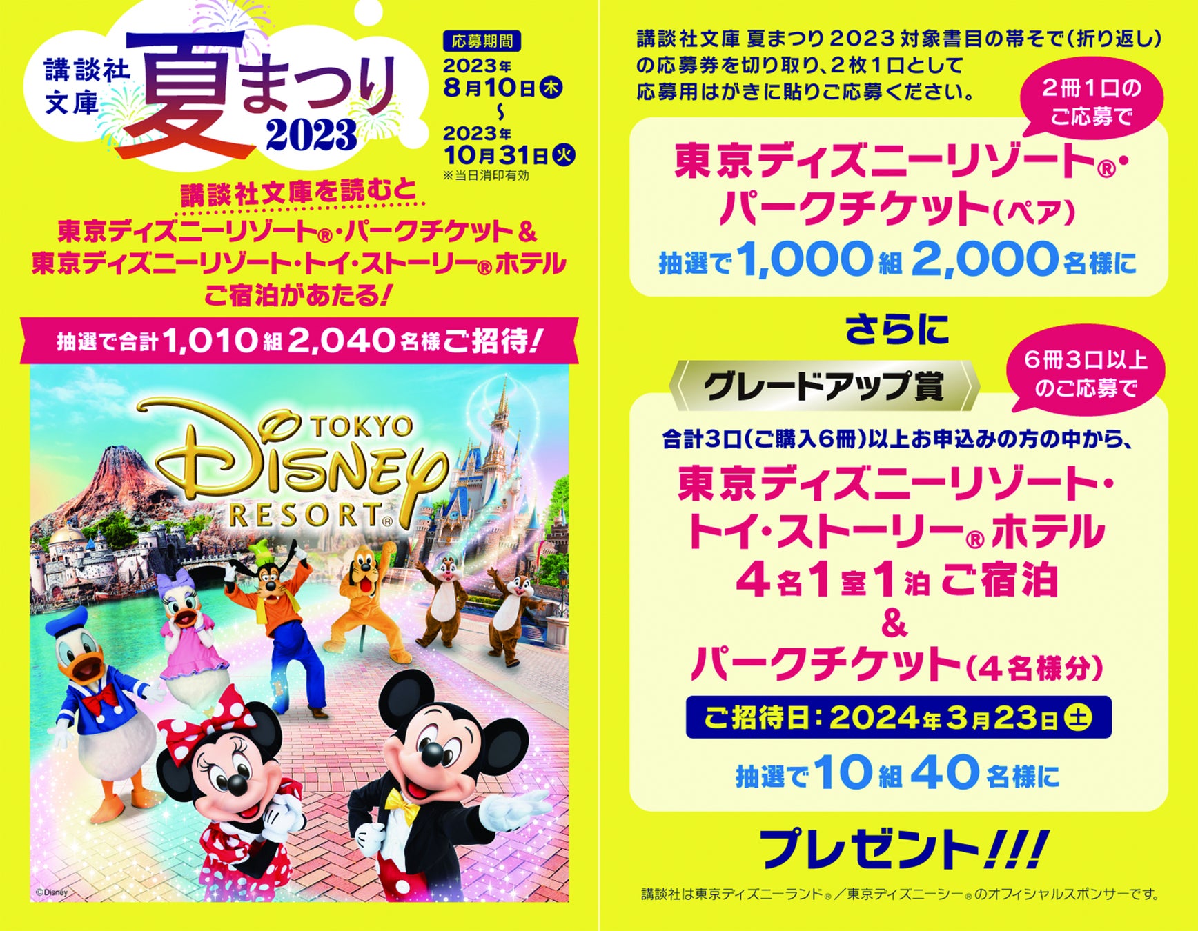 株式会社講談社(本社:東京都文京区)は、『講談社文庫夏祭り2023』と題したフェアを全国のフェア参加書店にて開催いたします。 本フェアは、東京ディズニーリゾート®や、東京ディズニーリゾート・トイ・ストーリー®ホテルへのご招待など、講談社ならではの特典が満載です。
