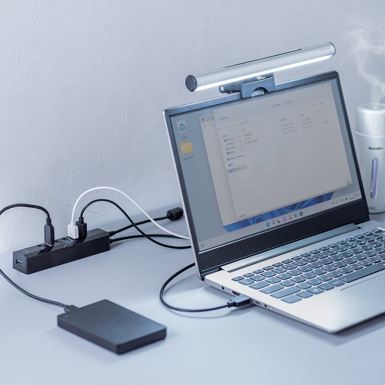 約76gの軽量設計と幅約13.6㎝のコンパクトボディで、モニター周りでも邪魔にならずデスク上のスペースを有効活用できます。LEDインジケーター搭載で通電もひと目で分かり、快適なパソコンライフをサポートします。