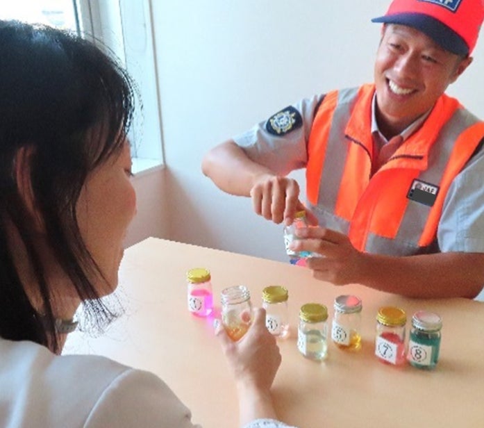 【液体判別チャレンジ】机の上に、色とりどりの液体の入った瓶があります。車に関する液体やそうでない液体も…。液体は全部で10種類。もちろんJAF隊員に聞くこともできます。たくさん正解された方には「優秀賞」を進呈します。