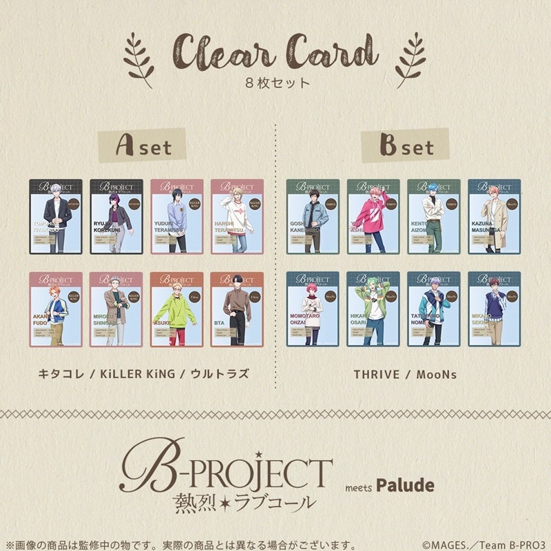【B-PROJECT ~熱烈*ラブコール~】クリアカード8枚セット(〈A〉キタコレ / KiLLER KiNG / ウルトラズ)(〈B〉THRIVE/MooNs)価格:880円(税込)