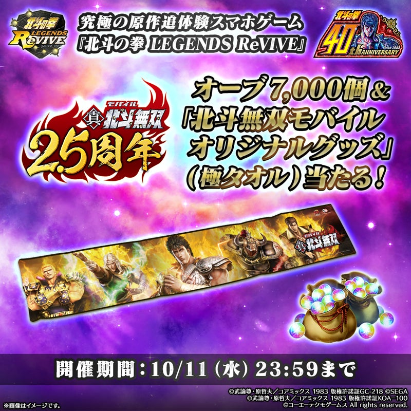 『北斗の拳』40周年&「北斗リバイブ」4周年記念大感謝キャンペーン第三弾! 「北斗リバイブ」公式アカウントと「北斗無双モバイル」公式アカウントをフォローのうえ、対象投稿をリポスト(RT)した方から抽選で10名様に、「オーブ7,000個&北斗無双モバイル オリジナルグッズ(極タオル)」をプレゼントします。奮ってご応募ください!