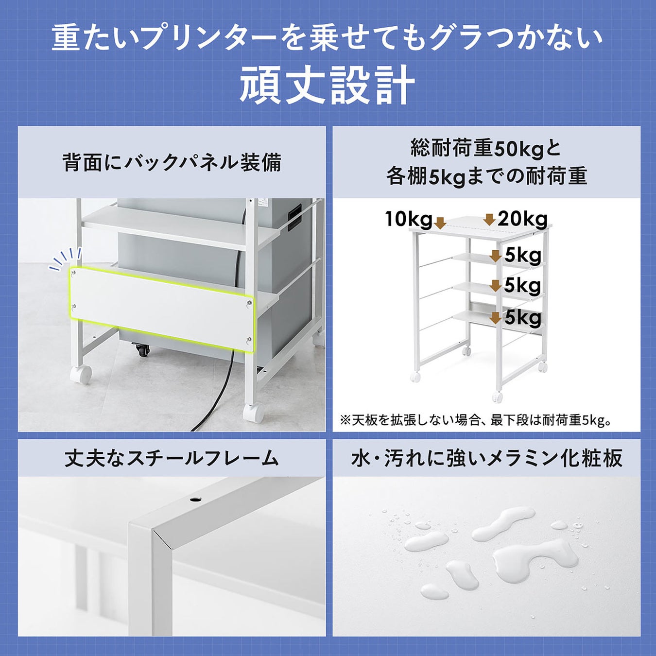 耐摩耗性・耐水性に優れたメラミン天板とスチールフレームの組み合わせで、総耐荷重は50kg。重い機器も安心して置けるタフさが魅力。長く使える耐久性を重視した設計です。