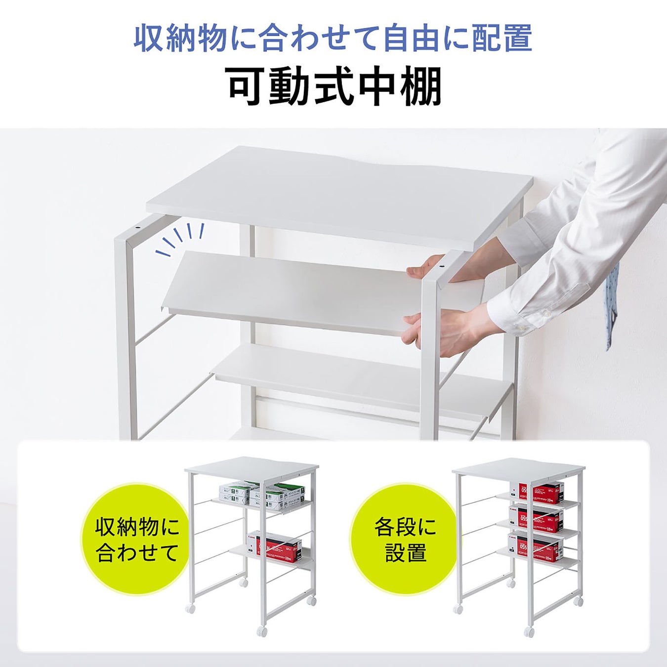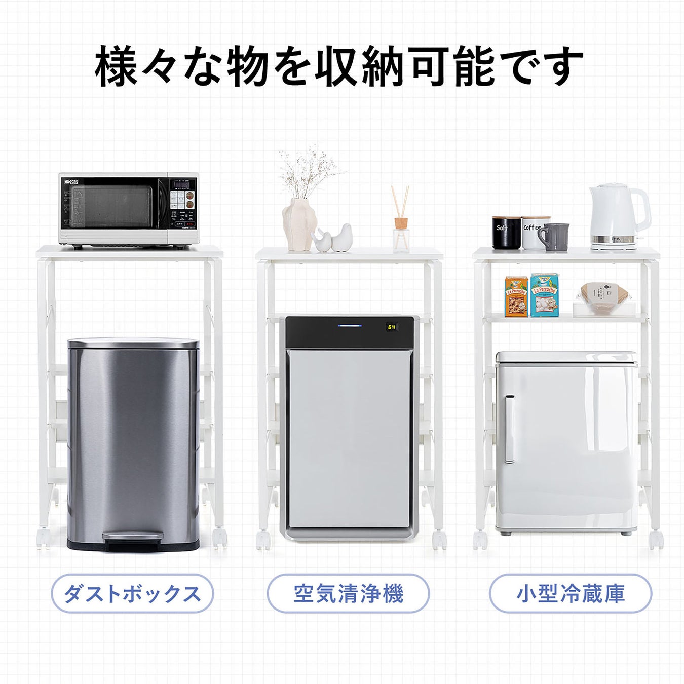 キャスター付きだから移動や掃除もスムーズ。ストッパー付きでしっかり固定もできるから、安全性も◎。中棚は高さ調整可能で、収納物に応じて自由にアレンジ可能です。