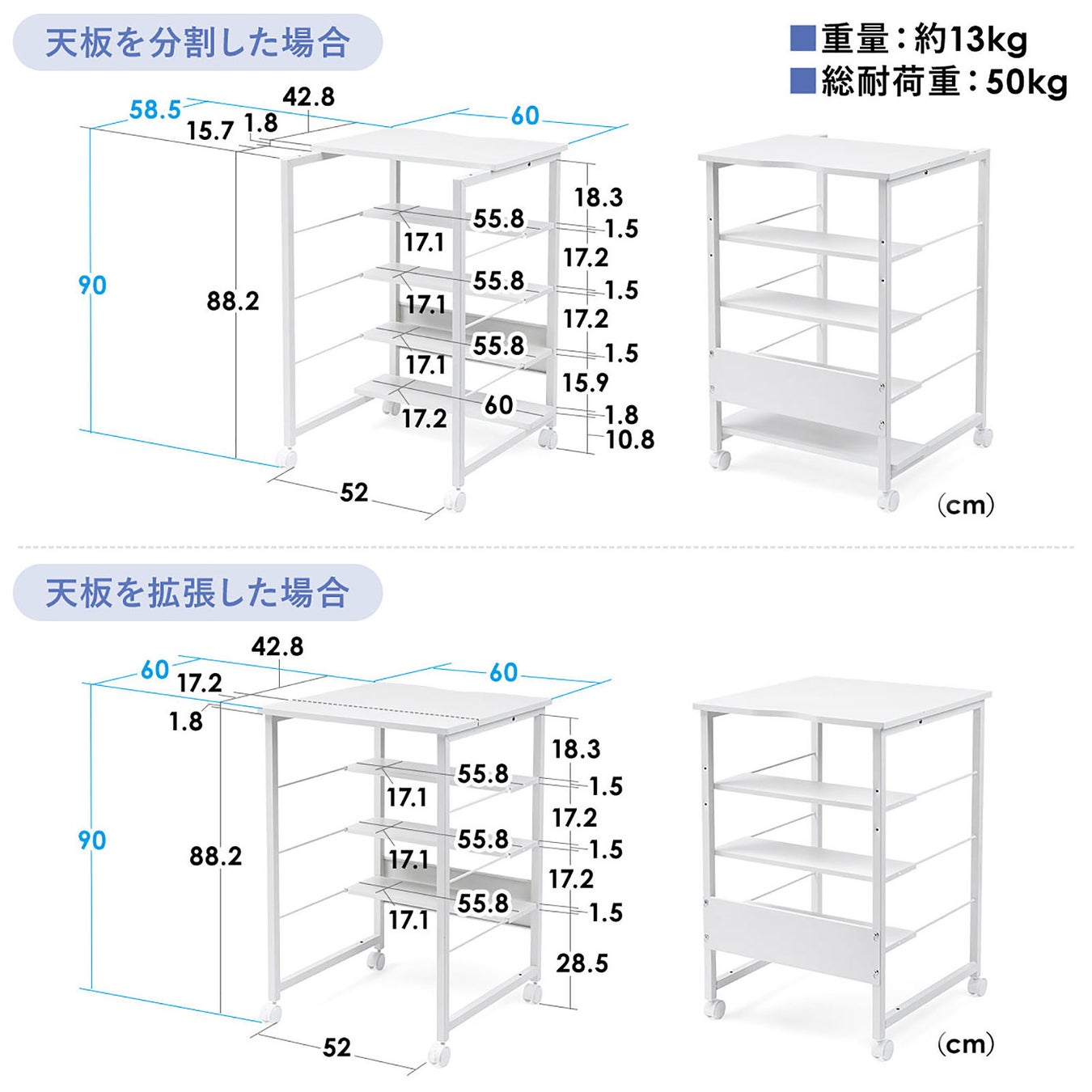 ・機器のサイズに合わせて天板を分割・拡張できる