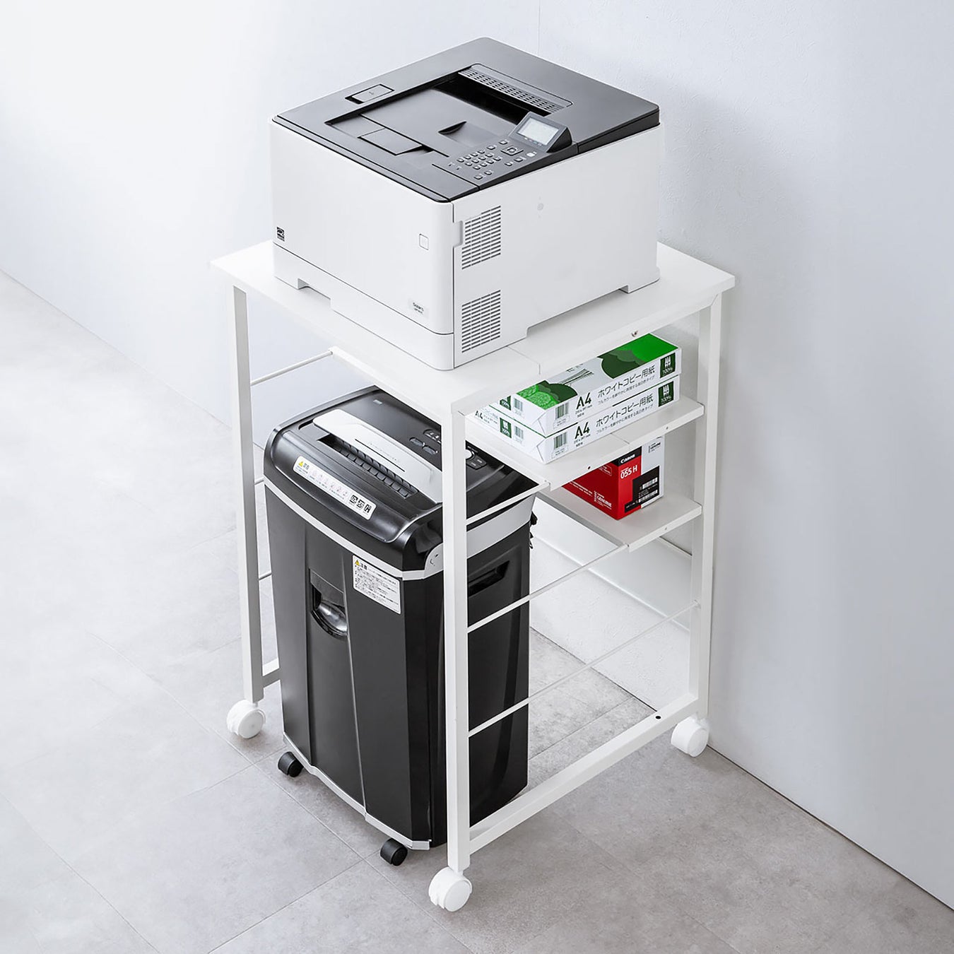 天板の上には小型A3プリンタを、下にはシュレッダーや用紙、インクなどをまとめて収納。プリンタ周りが雑然としがちなデスクスペースを、1台のラックでスッキリ整頓。オープンタイプだから取り出しやすさも抜群です。