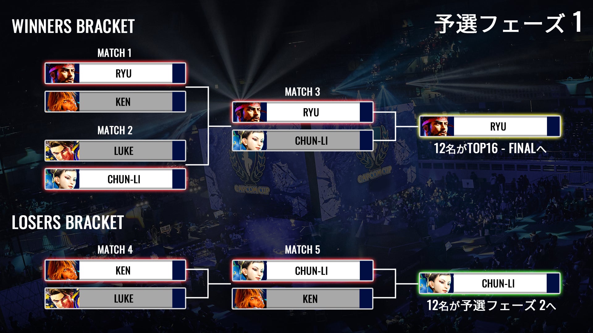 ウィナーズ突破の1名は「TOP16 - FINAL」へ、ルーザーズ突破の1名は「予選フェーズ2」へ進出。