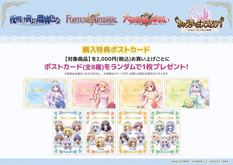 期間中、ゲーマーズオンラインショップにて「オーガスト」対象商品を2,000円(税込)お買い上げごとに、特典ポストカード(全8種)をランダムで1枚プレゼント!