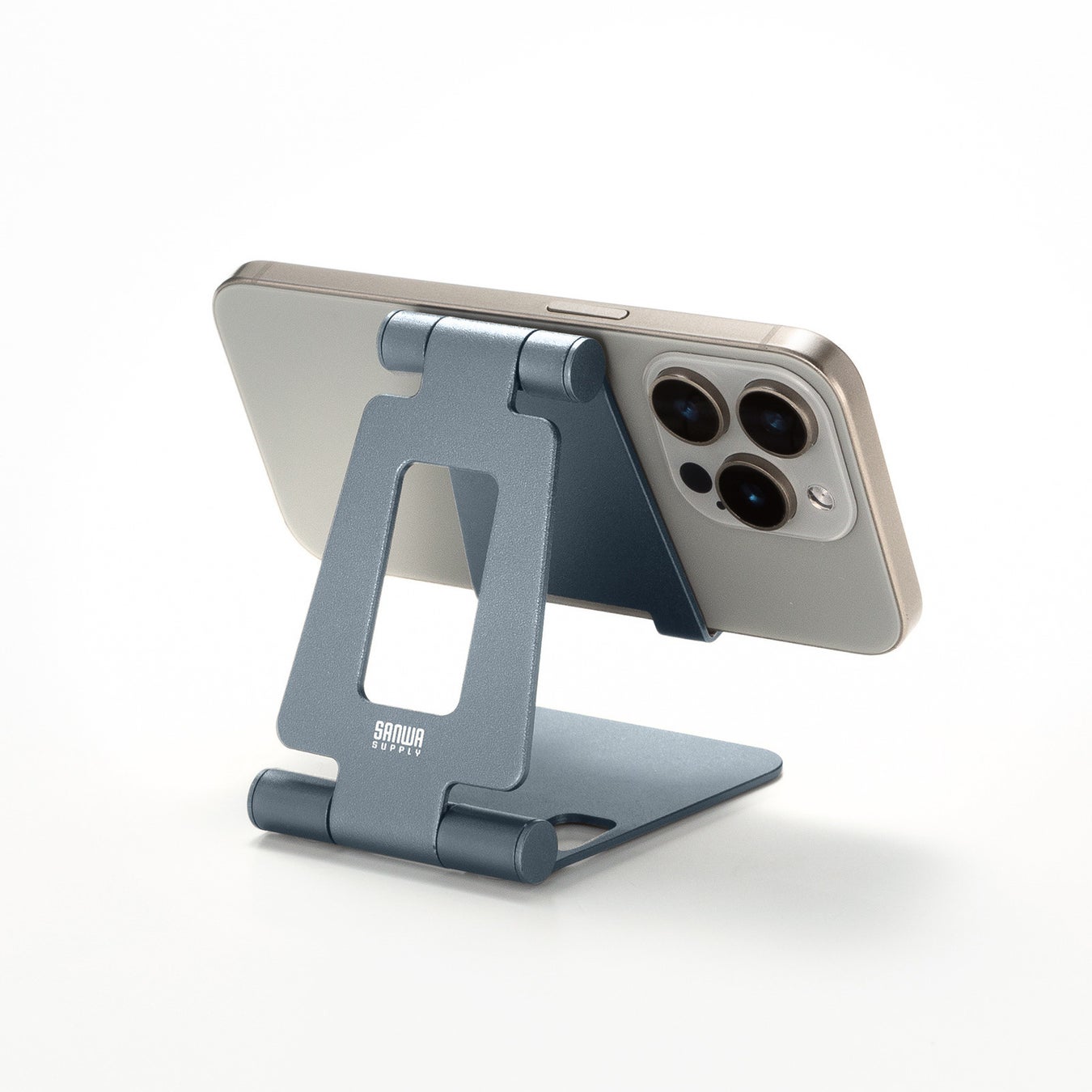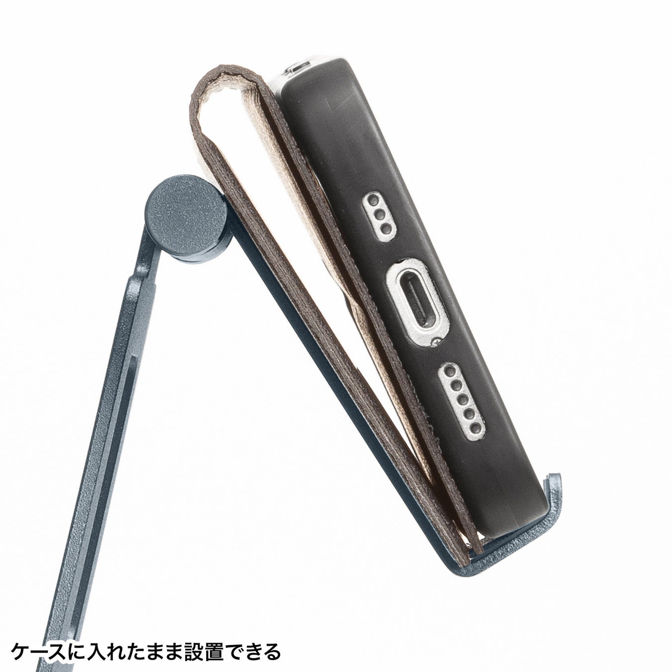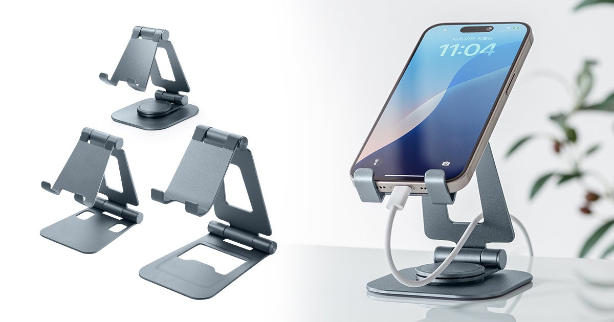 ケースを付けたままでも置ける2関節で角度を自由に調整可能な折りたたみモバイルアルミスタンドを発売