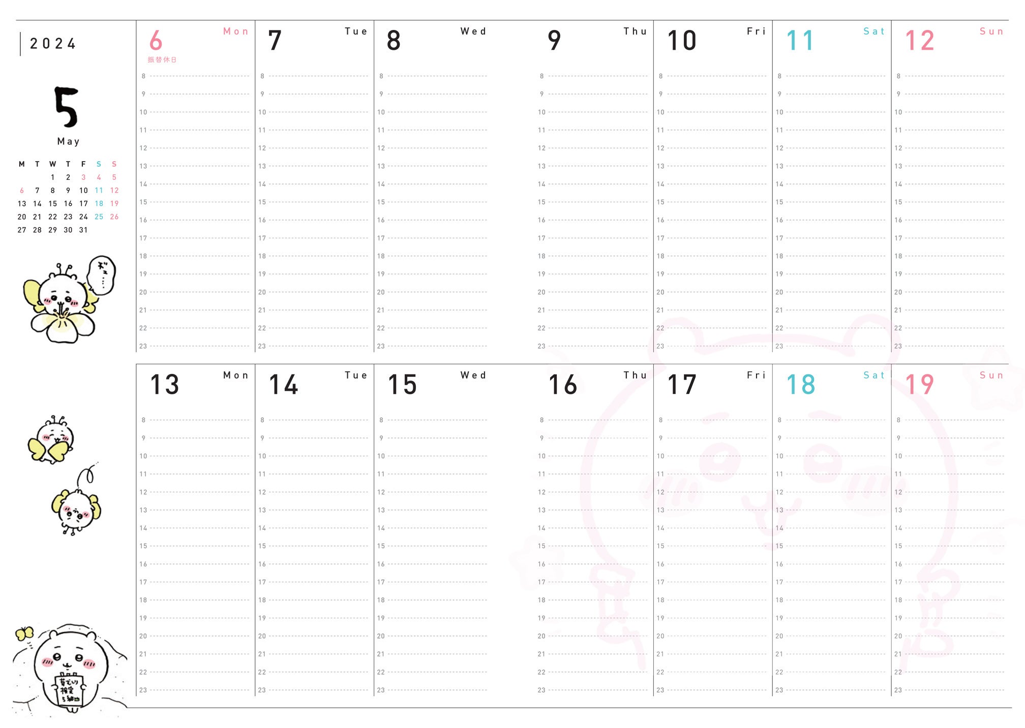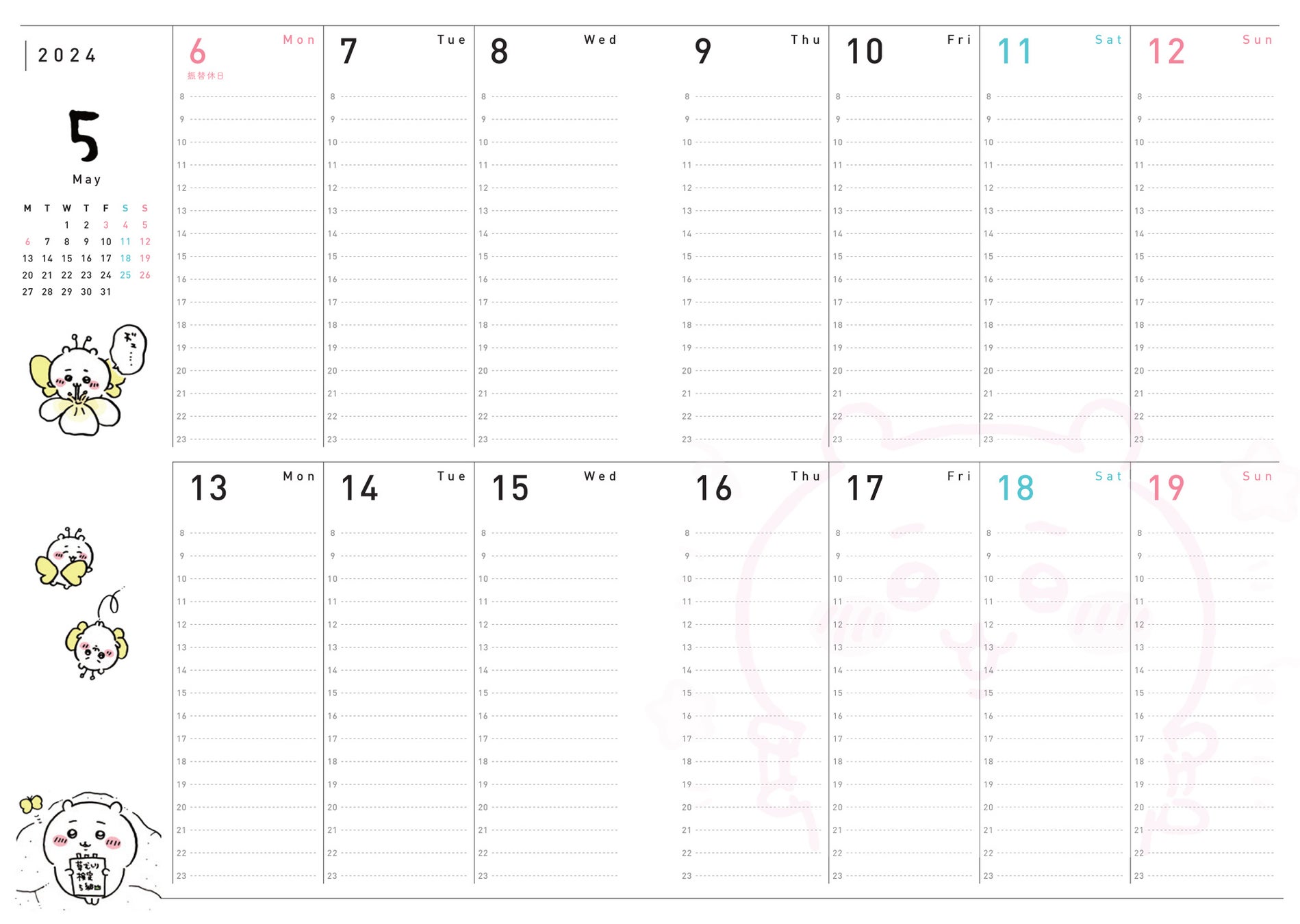 この作品に登場する、ちいかわ、ハチワレ、うさぎといったキャラクターたちの魅力がいっぱい詰まった2024年度のスケジュール帳になります。大きさはB6サイズで、月間ブロック&見開き2週間ホリゾンタルの混合仕様となっています。1月始まりと非常に使いやすい形式になっています。また、今年度版から、ちいかわ、ハチワレ、うさぎの誕生日も明記しています。