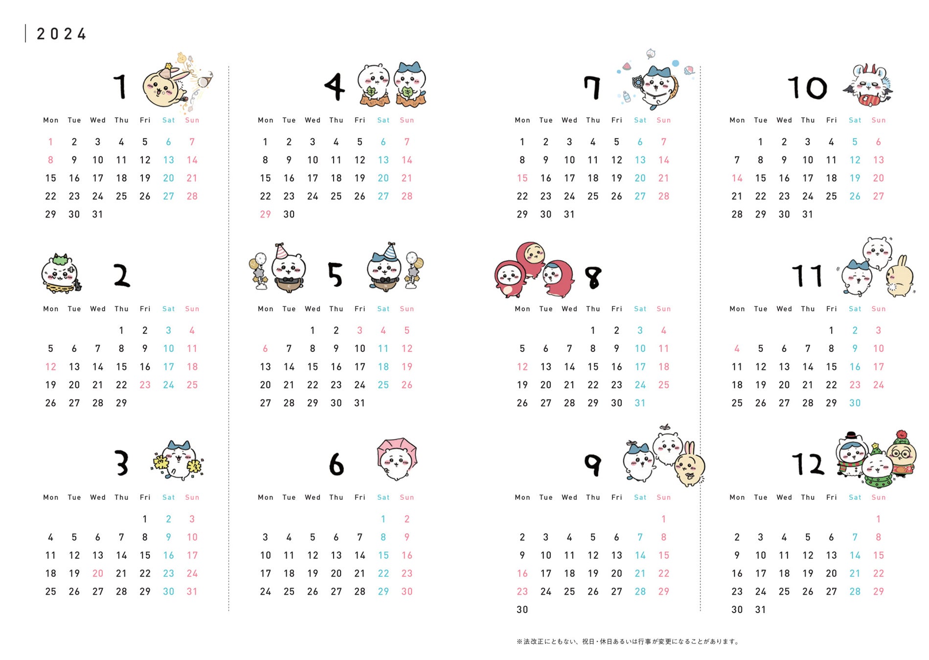 Twitterで人気の『ちいかわ』キャラクターをモチーフにした2024年度の年間スケジュール帳。月間と週間の2ウェイ方式です