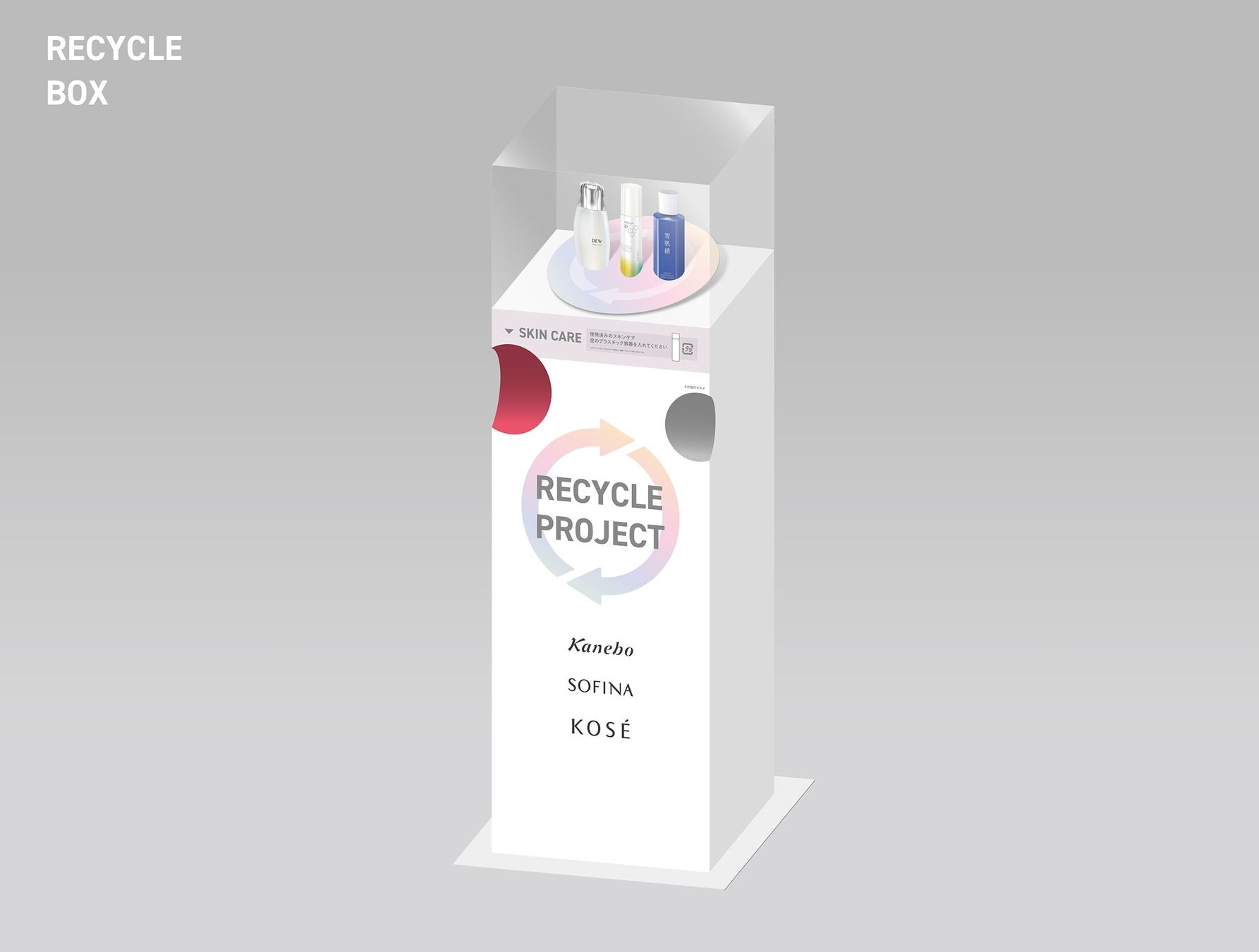 当社は、この取り組みに賛同し、10月1日(水)より、東京都、千葉県、埼玉県の「イオン」「イオンスタイル」約70店舗※1)内で展開する花王グループの花王ソフィーナとカネボウ化粧品、コーセーの各売場に回収ボックスを設置し、お客さまに持参いただいた使用済み化粧品プラスチック容器の回収を実施します。回収された容器は、再生素材を生成し、それを再び、花王グループとコーセーの化粧品容器の一部に採用する水平リサイクルに活用されます。